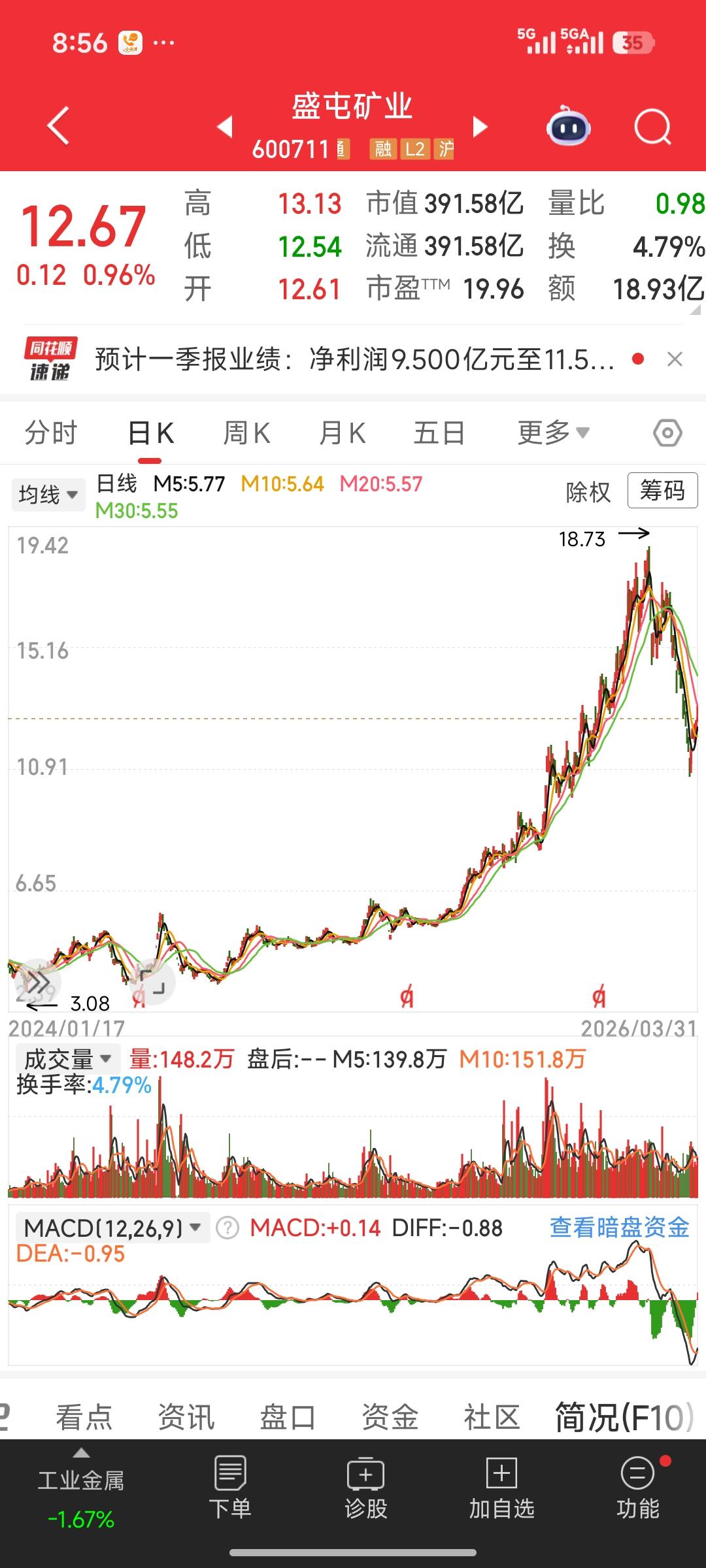 盛屯矿业炸板!Q1净利预增295%,9.5亿–11.5亿,量价齐升疯赚! 3月31日晚,盛屯矿业(600711)发布业绩预告,一季度净利同比暴增226%–295%,单季赚近10亿,环比去年四季度涨超3倍 ! 核心逻辑:刚果(金)铜钴项目产量大增,叠加铜价维持9.5万高位,自产矿成本低、利润拉满 。公司提质增效、成本大降,钴价高位再添红利 。 这是真·业绩爆发,不是概念!铜钴紧平衡延续,全年高增长稳了,怪不得股价从三块已经涨到16块了,大资金真的是先知先觉啊股价已经起飞好久了!