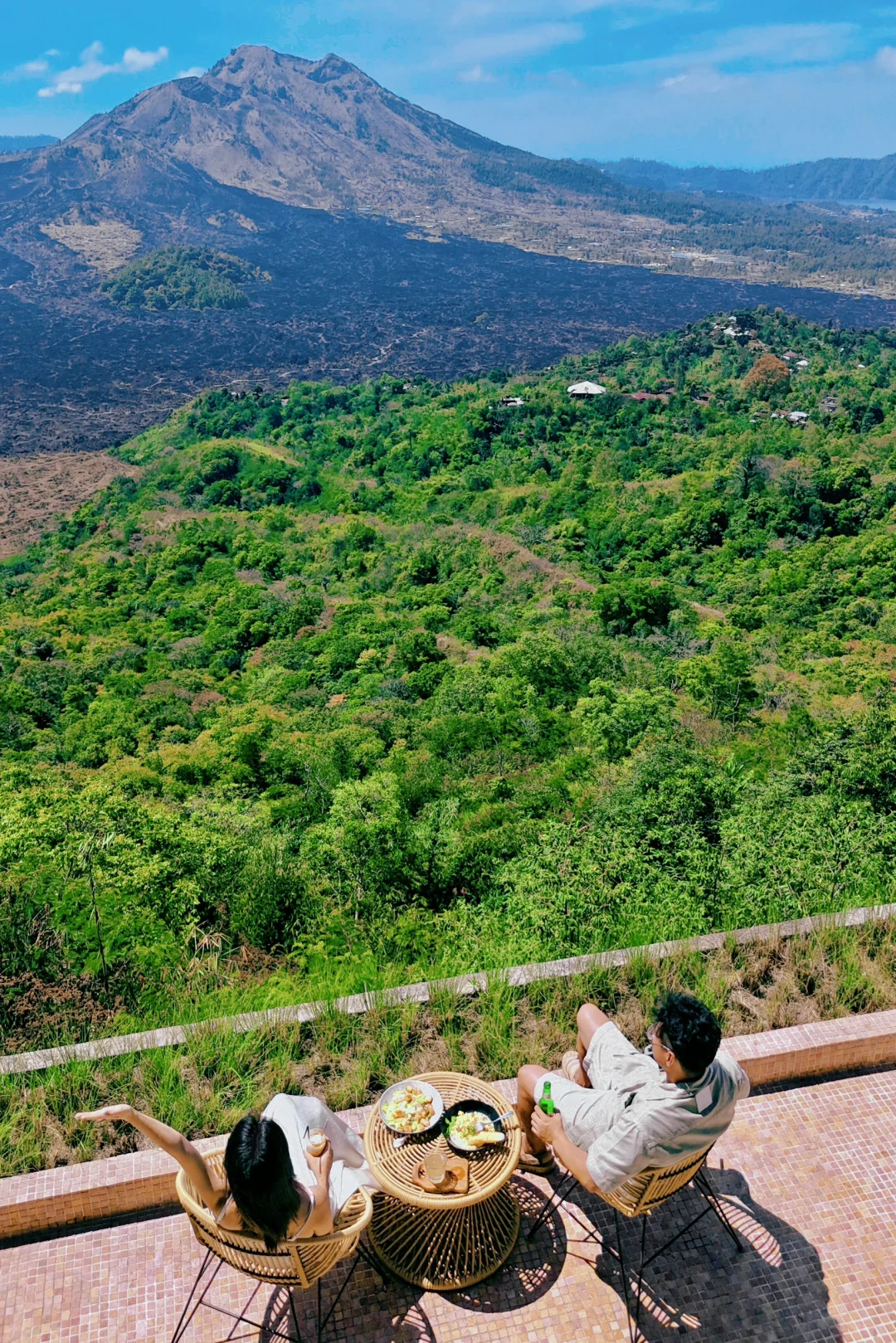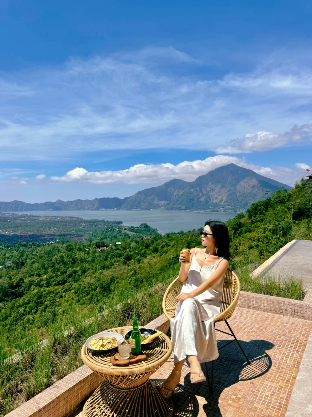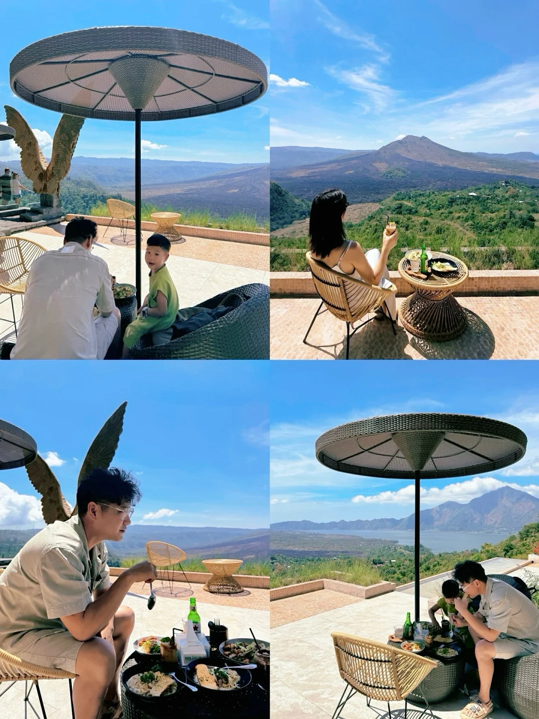 到了发现整条路全是各式各样有特色的咖啡店,montana看了一眼没什么人而且主要的风景就是在吊床那里,akasa一进去就被震撼了,直面两座火山还有火山湖,三层楼每个位置都有不同的风景,我们坐在一楼正中间,四份餐+三杯饮品不到200rmb,味道都不错,缺点是会有苍蝇飞,去的这天28度加上阳光,山上不冷不热很舒服。