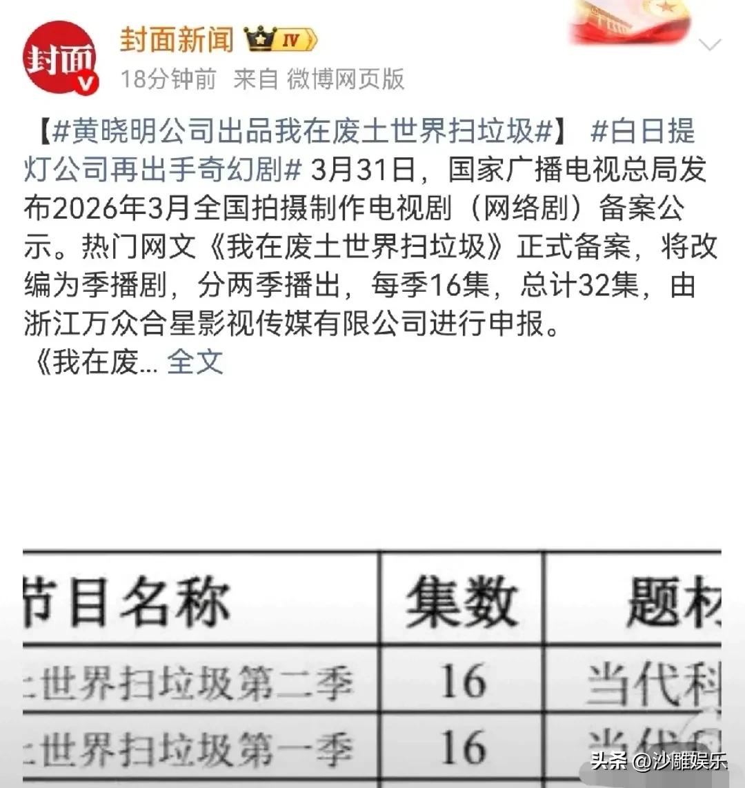 黄晓明,正式官宣! 3月31日深夜,正当大家都准备熄灯睡觉时,国家广电总局的一纸备案公示,直接把黄晓明送上了热搜榜首。 这一次,不是因为他演的戏被群嘲,也不是因为感情生活,而是因为他带着一本“宝藏神书”杀回来了——高人气网文 《我在废土世界扫垃圾》正式官宣影视化,出品方正是黄晓明母亲控股、黄晓明本人担任核心出品人的浙江万众合星影视传媒。 消息一出,书迷圈直接炸了锅。要知道,这本小说在网文圈可不是一般的火,那可是被无数读者奉为“废土流天花板”的宝藏作品,自带庞大的原著粉基础。 先给大家科普一下这部剧的“硬核”设定。 原著讲的是主角祝宁,原本在丧尸世界大杀四方,结果意外身死,穿越到一个充满未知的废土世界,成了最低等的五等公民,只能靠“扫垃圾”为生。但就在这份看似卑微的工作中,她意外触碰到了这个世界的终极隐秘。 废土科幻、无限流、大女主——这三个标签叠在一起,简直就是当下网文影视化的“流量密码”。而且原著作者“有花在野”文笔扎实,故事里不仅有紧张刺激的副本,更有对人性、社会的深刻思考。也难怪书粉们一边期待一边又担心:“千万别拍毁了!” 值得一提的是,这部剧将做成季播剧,分两季播出,总共32集。这个体量对于废土题材来说,算是比较充裕的,如果制作精良,完全可以构建出一个完整的废土宇宙。 当然,比起剧情本身,大家更关注的是黄晓明这次的动向。 要说这家出品公司“万众合星”,来头确实不小。由黄晓明母亲张素霞控股,黄晓明亲自操盘。大家别忘了,就在前几天,刚刚热播的古装奇幻剧《白日提灯》(迪丽热巴、陈飞宇主演),同样是这家公司出品的,成绩相当亮眼。 那部剧开播50分钟热度破22000,预约量突破650万,直接坐稳了热播榜第一。黄晓明甚至在阅文盛典上自嘲:“我是出品人,我没演啊,不能糟蹋这戏。”——这波反向操作,不仅没掉粉,反而让大家觉得他“格局打开”了。 接连两部大IP,一部古装奇幻爆款,一部废土科幻大制作。黄晓明这是不打算演戏,专心当“幕后金主”了? 说实话,黄晓明这几年在投资圈没少折腾。从入股短剧公司到投资机器人租赁平台,他也算得上是娱乐圈的“投资大户”。虽然之前有些项目确实扑得悄无声息,甚至被调侃“屡投屡败”。 但这一次,我觉得他或许真的踩在了点上。 首先,他手里的《白日提灯》已经证明了,他作为出品人是能做出爆款的,而且审美在线,舍得砸钱做特效、搞实景。 其次,《我在废土世界扫垃圾》这个IP的含金量极高,只要不魔改,只要特效不五毛,以原著庞大的粉丝基础和题材的新鲜感,这剧想不火都难。 更重要的是,黄晓明正在完成一场身份转变。演员黄晓明或许备受争议,但资本黄晓明,正在悄悄建立起自己的影视版图。 从“我要我觉得”的霸总,到“我不演怕糟蹋戏”的出品人,他学会了用资源整合能力去替代单纯的曝光欲。这不仅是个人定位的升级,更是内娱演员转型的一个新样本。 废土世界的垃圾不好扫,影视化的漫漫长路也不好走。但这一次,我愿意赌晓明哥能赢。 毕竟,谁不想看到一个曾经被全网玩梗的男人,最后靠“钞能力”和“眼光”打一个漂亮的翻身仗呢?