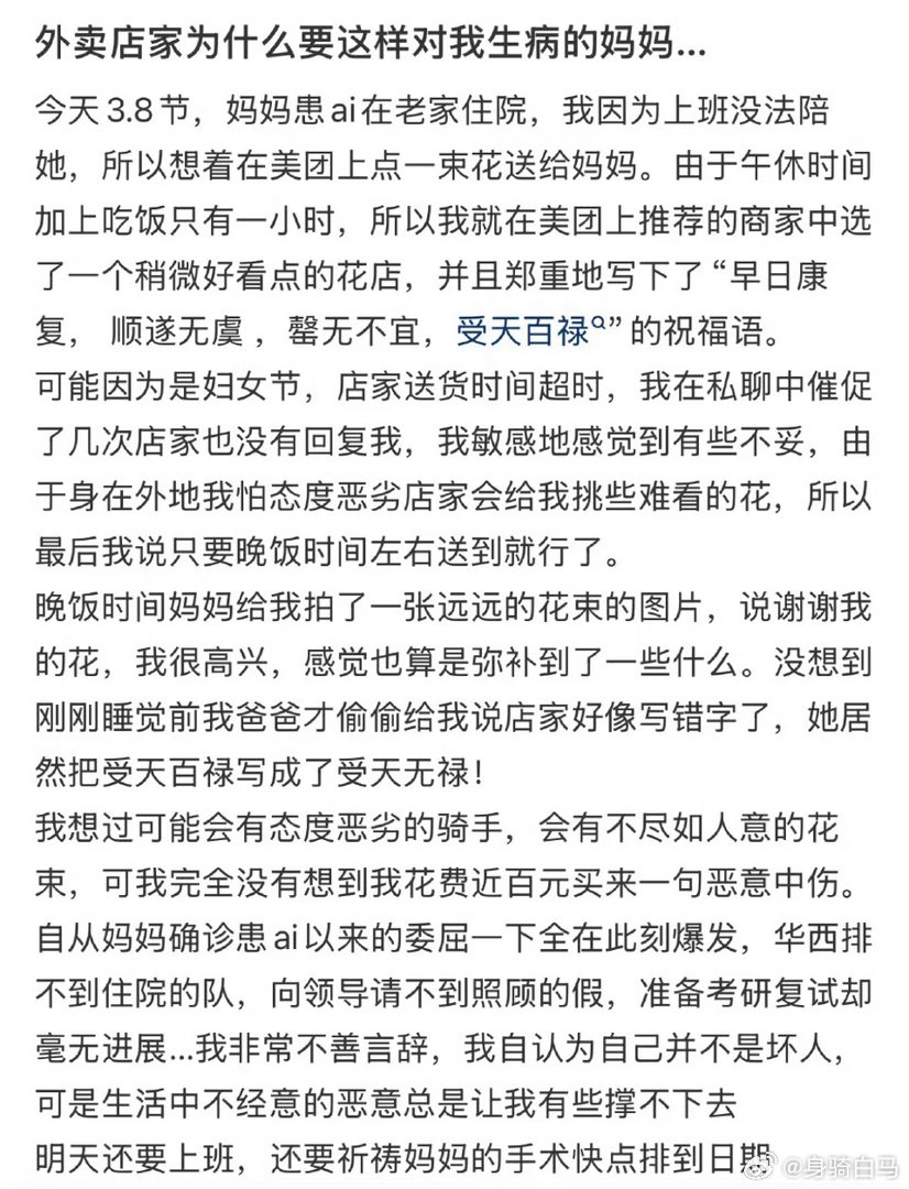 外卖店家为什么要这样对我生病的妈妈?