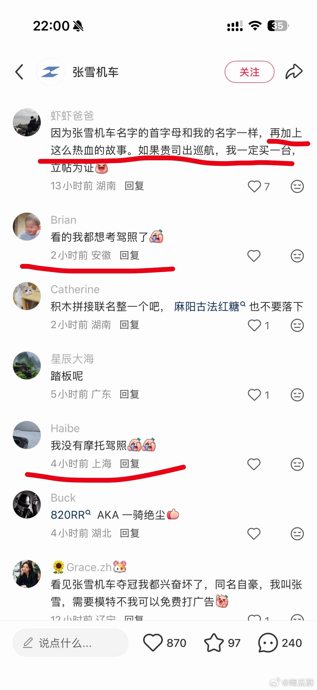 (图二图三,是张雪机车宣布820RR开启预定下的评论,很多没有摩托驾照的人表示想买张雪。)