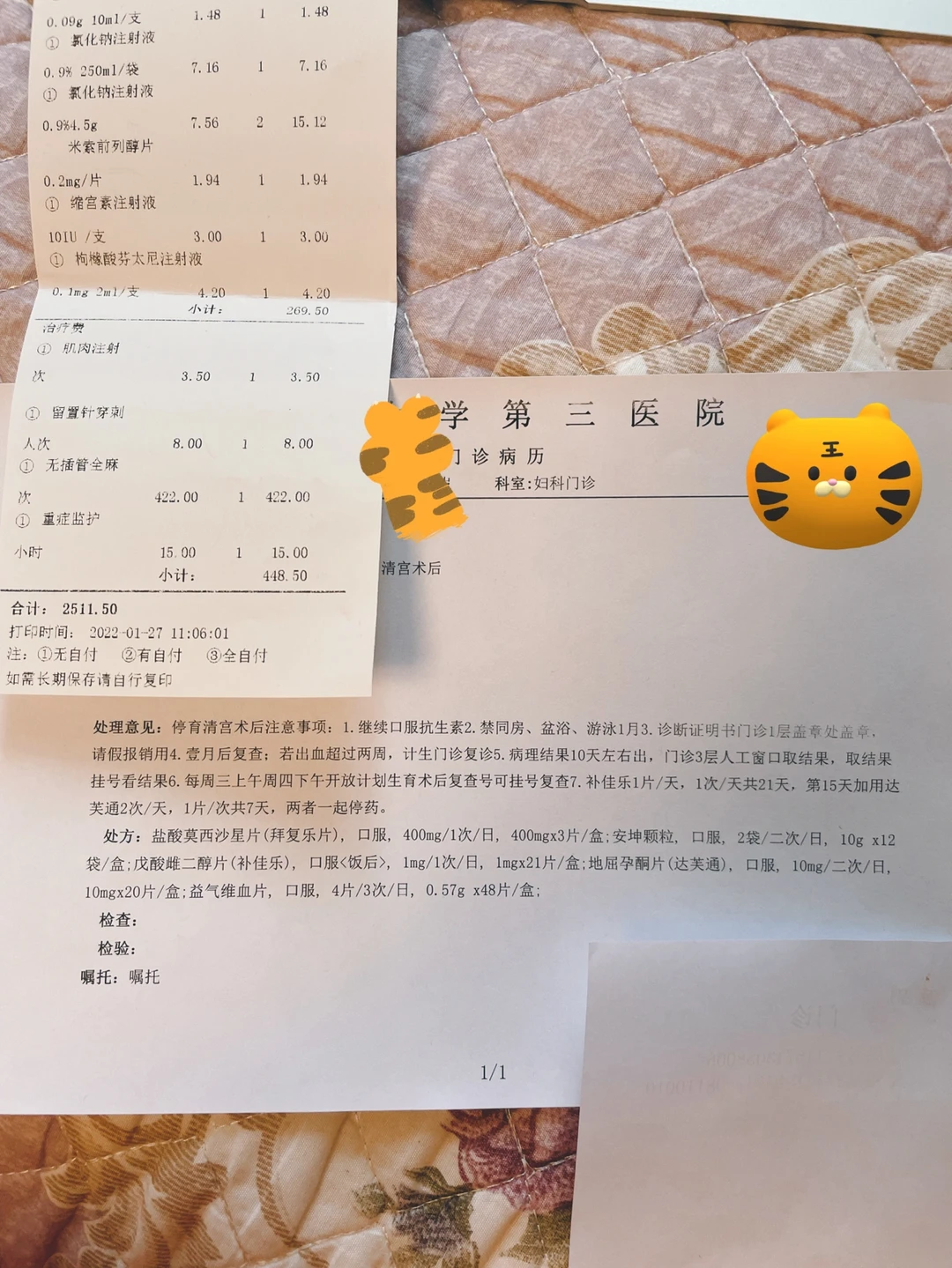 总共费用是5000多,包括1500多的手术和药物费,1000的宫腔镜费,2400的染色体费用,还有一些抽血、核酸、胸片什么的。这些费用回头可以走生育保险,报销一部分。