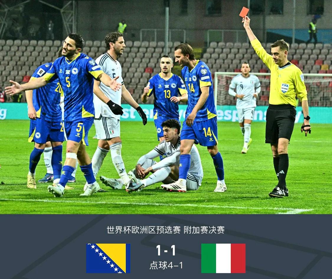 点球大战被淘汰!没想到扩军后意大利队仍旧还是无缘世界杯。 对阵波黑队的世预赛附加赛,意大利队半场结束前就犯了个大错误。面对波黑队的梅米奇即将形成的单刀球,意大利队的巴斯托尼还是太鲁莽了,一个铲球犯规直接被红牌罚下。随后意大利只能以10人应战。 在经历了常规时间90分钟以及加时这样漫长的比赛后,意大利守住了平局,只不过点球大战上他们的心态率先崩溃。20岁的皮奥被加图索第一个安排到了点球点主罚。随后他把皮球打飞,最终意大利队倒在了点球大战上,无缘美加墨世界杯。 大家如何看待意大利再一次无缘世界杯呢?