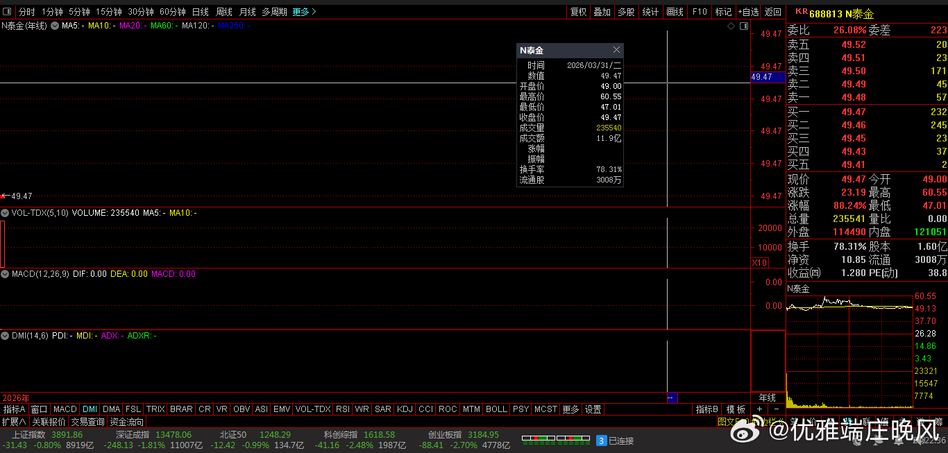 收盘价:49.47元。涨跌幅:88.24%。净流入: 5.98亿