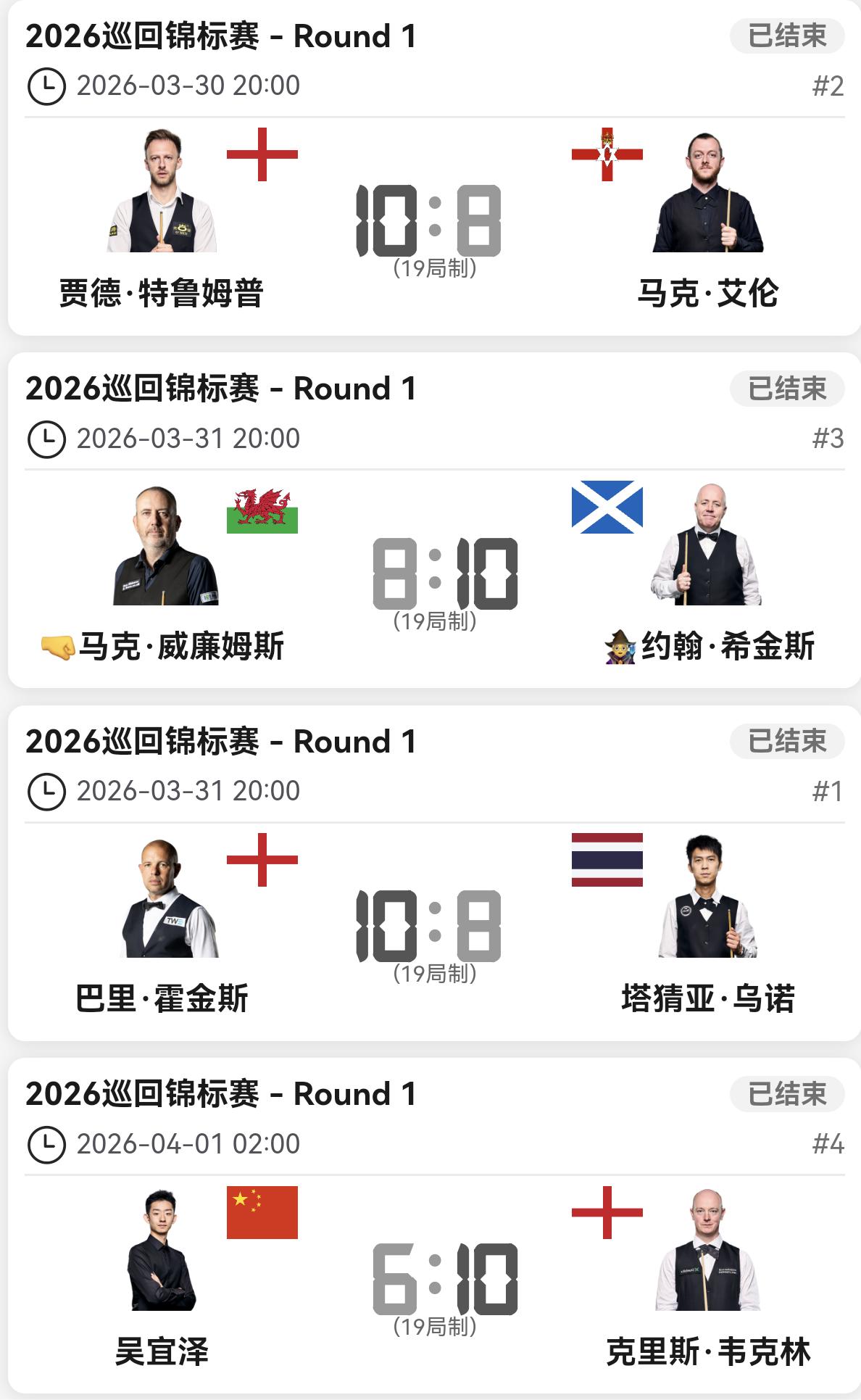 巡回赛八强出炉,吴宜泽6-2领先,被对手8连鞭淘汰。今天丁俊晖生日,主任生日快乐