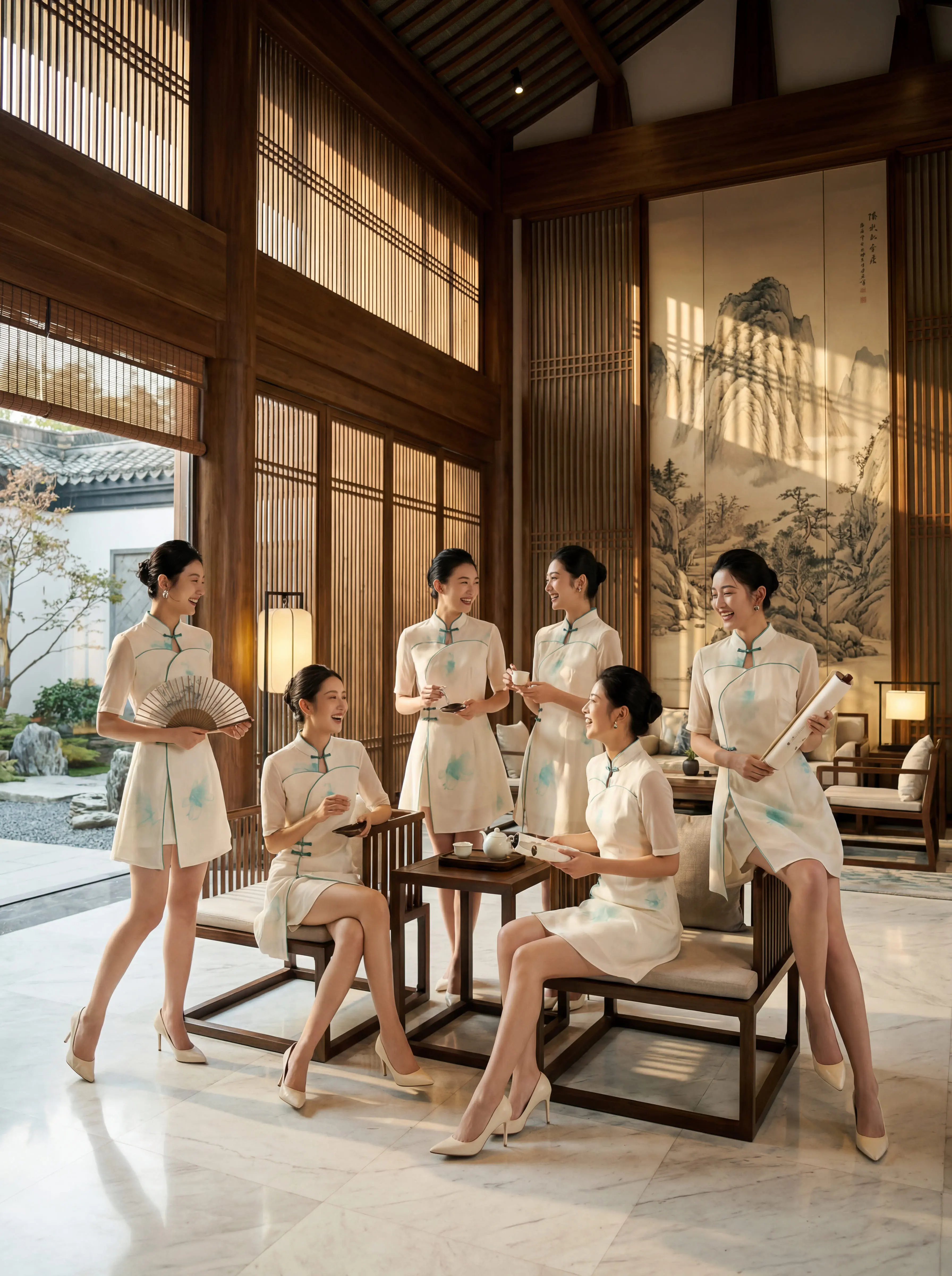 竖条纹旗袍的开叉恰到好处,衬得腿型修长,线条舒展而柔和;肤色均匀且细腻,姿态优雅