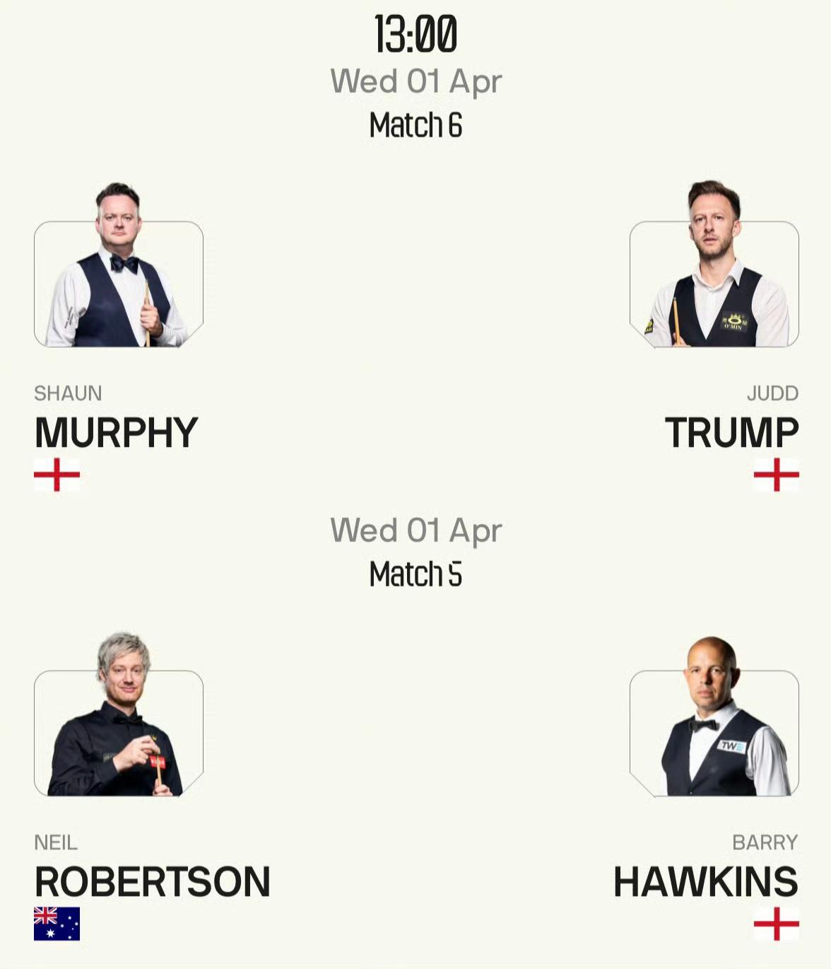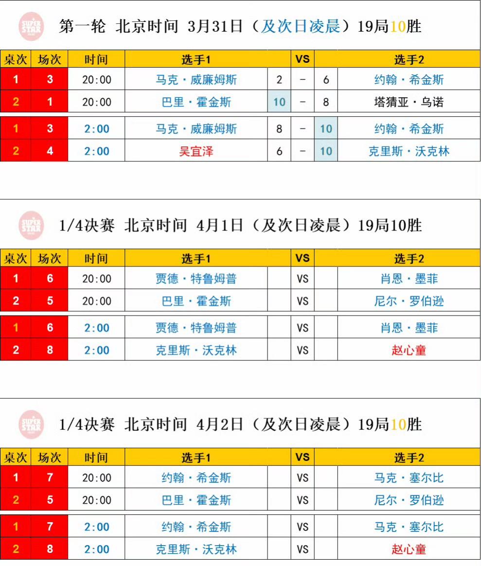 2026斯诺克巡回锦标赛首轮全部结束,丁俊晖成最大赢家,吴宜泽搬石头砸自己,特鲁姆普状态复苏,希金斯依然老当益壮。 晋级巡回锦标赛八强的4个名额:特鲁姆普、霍金斯、韦克林、希金斯。 特鲁姆普10-8艾伦,1/4决赛对阵墨菲 霍金斯10-8塔猜亚,1/4决赛对阵萝卜 韦克林10-6吴宜泽,1/4决赛对阵赵心童 希金斯10-8马威,1/4决赛对阵塞尔比