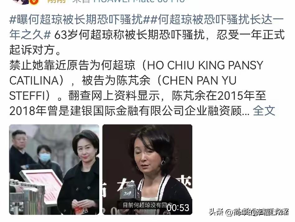 何超琼,冲上热搜!3月31日晚上,赌王最厉害的女儿何超琼,突然冲上热搜,这次她不忍不了了,直接把前证监会持牌代表陈芃余,告上了香港高等法院。 何超琼这位赌王最受瞩目的女儿,这次不再是商界亮相的从容模样。她直接把前证监会持牌代表陈芃余告上香港高等法院,忍无可忍的背后,是长达一年的骚扰与恐吓。 事情要从2025年3月说起,陈芃余的纠缠就没断过,直到何超琼终于拿起法律武器。她的诉求很明确:禁止对方靠近自己、美高梅及信德集团办公室30米范围;不准以任何形式联系自己,更不能再散播诽谤言论;同时,追讨相应的损害赔偿。 这桩官司透着说不出的蹊跷,陈芃余不是无名之辈,2015到2018年在金融圈相当活跃,做过建银国际的企业融资顾问,还是证券持牌代表,只是2018年被证监会除牌。如今住在香港荃湾柏傲湾的她,为何偏偏盯上已年近花甲的何超琼? 论财力地位,何超琼作为赌王接班人,执掌着庞大的商业版图,按理说不会为蝇头小利卷入是非。更耐人寻味的是,两人都是女性,这场对峙便多了层说不清道不明的迷雾。是旧日恩怨?还是另有图谋? 何家这些年的“热闹”从未断过,赌王去世后,灵堂上就有自称私生女的人闹场,后来又冒出隐身儿子何猷邦的身世谜团,桩桩件件都成了大众茶余饭后的谈资。 但这次何超琼被骚扰,似乎和那些家族恩怨搭不上边。一个前金融从业者,与顶级豪门继承人,原本该是两条平行线,却硬生生纠缠出一场官司。陈芃余的动机成了最大的谜——是职业经历中结下的梁子?还是有什么不为人知的利益牵扯? 有人猜测,或许与当年的金融圈经历有关。陈芃余被除牌的背后,是否藏着与何超琼相关的故事?又或者,这只是一场单纯的恶意骚扰?毕竟,公众人物遭遇莫名纠缠的例子,并不少见。 何超琼的选择,其实不难理解。商界摸爬滚打多年,她向来懂得权衡,但面对持续一年的滋扰,显然已触及底线。法律是最后的盾牌,既为了止损,也是向外界传递明确态度:即便是公众人物,私人空间与名誉也不容侵犯。 只是这场官司背后的真相,恐怕得等开庭审理才能慢慢揭开。陈芃余会如何回应?她的行为是否另有隐情?何超琼口中的“诽谤言论”,又涉及哪些内容? 何家的故事总带着传奇色彩,这次的官司却少了几分豪门恩怨的狗血,多了些现实中的无奈。再强大的人,面对持续的恶意纠缠,也难免疲惫。何超琼的强硬反击,或许也在提醒所有人:面对骚扰,沉默只会纵容,拿起法律武器才是最有力的保护。 热搜的热度总会褪去,但这场官司的走向,依然让人好奇。毕竟,两个身份背景截然不同的女性,因这样一场对峙站在法庭两端,背后藏着的,或许不只是个人恩怨那么简单。答案,还得等法庭上见分晓。