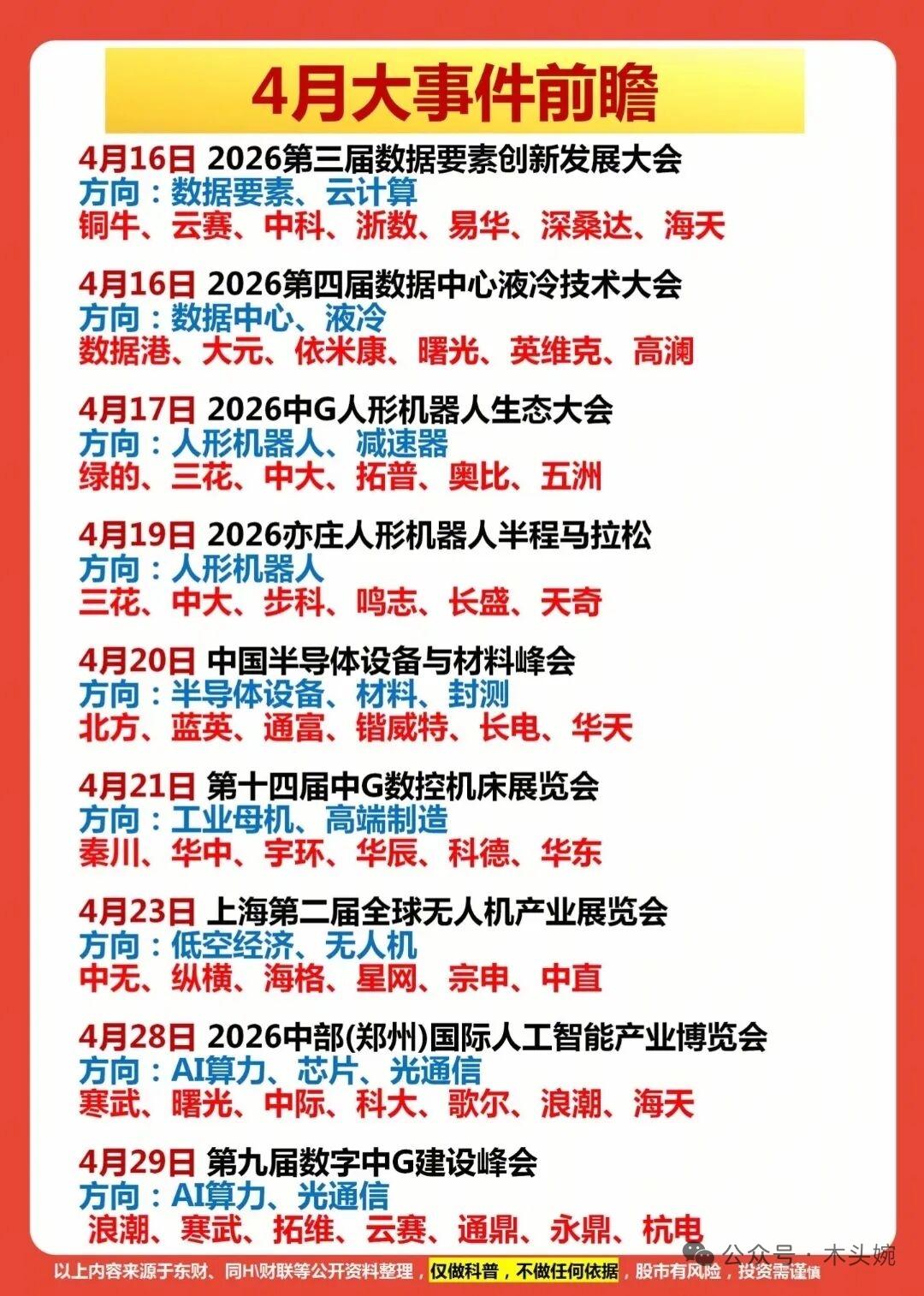4月产业“超级风暴”来袭!20+场顶会刷屏,储能、商业航天、人形机器人全炸场,你准备好了吗? 4月行情即将开启,一大波行业重磅会议密集来袭,豆包认为值得关注的四大主线: 9日AI算力产业大会将引爆算力硬件、光通信等科技主线。 17日人形机器人生态大会将加速机器人产业链商业化落地, 20日 中国半导体设备与材料峰会,半导体两场博览会持续强化国产替代逻辑。 23日全球无人机展则为低空经济赛道注入新动能,四大事件将成为4月把握科技成长行情的关键窗口。 ⚠️ 风险提示:以上内容仅为公开信息整理,不构成任何投资建议,股市有风险,投资需谨慎。