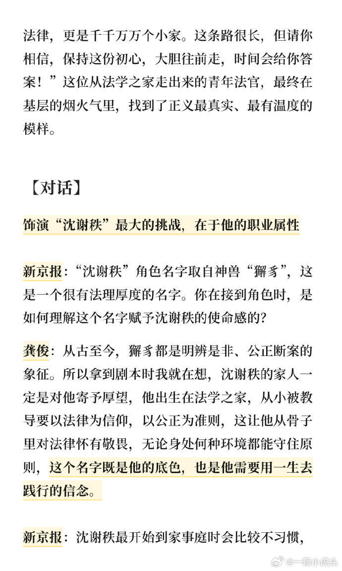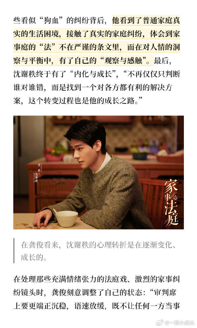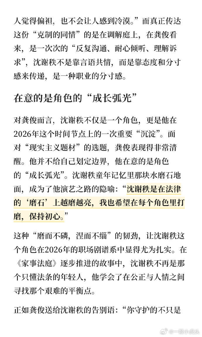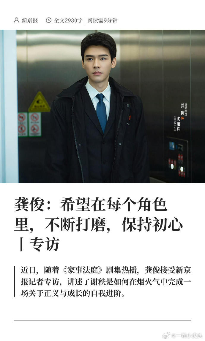 新京报家事法庭专访,龚俊:希望在角色里不断打磨,保持初心!沈谢秩是法学之家走出的法理少年,从高度理性到感同身受的蜕变,对演员龚俊而言沈谢秩不仅是一个角色,更是他在2026年这个时间节点上的一次重要“沉淀”。面对“现实主义题材”的选题,他并不给自己划定边界,他在意的是角色的“成长弧光”。