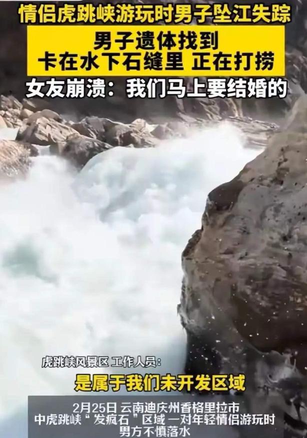 太揪心了!虎跳崖失足落水的小杜老师他的遗体无法打捞上岸,因遗体卡在石缝中,水下虹吸的作用无法用绳索拖拽! 事发地点在中虎跳峡的“发疯石”附近,这里是当地有名的网红打卡点,尽管属于未开发的危险区域,却依然吸引着大量游客慕名而来,甚至需要排队一两个小时才能在石头上拍一张照片。 当天,小杜老师和女友也加入了排队的人群,就在排队的间隙,意外悄然发生。 小杜老师手中的不锈钢水杯沾了灰尘,他一时兴起,想要到江边清洗干净,即便女友和随行向导反复劝阻,提醒他江边礁石长满苔藓、异常湿滑,他也并未放在心上,依旧蹲下身去清洗水杯。 清洗完毕起身的瞬间,脚下一滑,身体瞬间失去平衡,整个人直直栽进了下方的金沙江。 一旁的女友吓得魂飞魄散,下意识地将手中的登山杖递了过去,试图拉住他,可湍急的江水力道极大,瞬间就将登山杖冲断。 小杜老师在水中挣扎了几下,短暂浮现两次后,便被无情的激流卷向江底,彻底消失在众人的视线中。 随行向导见状,不顾自身安危,立刻跳入水中施救,可江水太过湍急,他不仅没能找到小杜老师,自己也险些被激流冲走,幸好岸上的人们及时出手,才将他拉了上来。 事件发生后,消防队和民间救援队第一时间赶到现场,展开了连续多日的搜救工作。 搜救人员沿着金沙江两岸反复搜寻,不放过任何一丝线索,先后找到了小杜老师的不锈钢水杯、折断的登山杖,还有他身上穿的黑色外套,可始终没有找到小杜老师的身影。 日复一日的搜救,一点点消耗着家属和救援人员的希望,每个人的心里都沉甸甸的,既期盼着奇迹发生,又不得不面对残酷的现实。 直到10天后,也就是3月6日,搜救人员通过水下探头,终于在水下5米的石缝中找到了小杜老师的遗体。 让人揪心的是,遗体距离水面仅有40厘米,近得能看清轮廓,可就是这短短的40厘米,却成了无法逾越的鸿沟。 家属看到这一幕时的心情,明明近在眼前,却怎么也无法触及,这种无力感,比失去亲人本身更令人窒息。 而造成这一切的关键,就是虎跳峡江底特有的水下虹吸作用——虎跳峡江底的巨石形成狭窄的水下通道,水流通过时流速骤增,产生强大的负压吸力,将遗体死死“咬”在石缝中,这也是虎跳崖失足落水的小杜老师他的遗体无法打捞上岸,因遗体卡在石缝中,水下虹吸的作用无法用绳索拖拽! 或许很多人不知道,小杜老师的这场旅行,有着特殊的意义。 这次和女友一起来云南,是他们的婚前旅行,两人刚拍完婚纱照,满心欢喜地规划着不久后的婚礼,规划着未来的美好生活,却没想到,一场意外,让所有的憧憬都化为泡影。 他原本有着光明的未来,有着爱他的家人和即将相伴一生的爱人,可这一切,都被这场突如其来的意外彻底打碎。 为了能让小杜老师早日回家,救援人员想尽了一切办法。 他们尝试用绳索套取遗体,派有十几年经验的专业潜水员下潜施救,甚至专门请教了业内的资深同行,可所有的努力都付诸东流。 水下虹吸的力量太过强大,像一只无形的巨手,将遗体牢牢吸在石缝中,丝毫无法撼动。 再加上雨季将至,峡谷即将涨水,水压会进一步增大,打捞工作会变得更加艰难,甚至没有任何可能。 经过一个多月的等待,经过救援人员的耐心劝说,小杜老师的父母和女友,终究还是接受了这个残酷的现实,红着眼圈,含泪同意放弃打捞。 白发人送黑发人,本身就是锥心之痛,而连孩子的最后一面都无法好好告别,连让他入土为安的愿望都无法实现,这份煎熬,恐怕会伴随他们一生。 有网友得知消息后,纷纷留言安慰家属,说就当是水葬,愿小杜老师安息,愿家属节哀顺变,这场悲剧,也引发了人们对户外安全的广泛讨论。 其实,当地景区和文旅部门,不止一次提醒过游客,“发疯石”附近是未开发区域,危险系数极高,禁止游客前往冒险打卡。 可总有一些人,心存侥幸,无视这些安全提醒,为了拍一张好看的照片,为了追求所谓的“极限体验”,不惜将自己的生命置于危险之中。 小杜老师的悲剧,从来都不是个例,每年都有类似的意外发生,可还是有人不长记性,总觉得“危险离自己很远”。 大自然的威力,从来都不由人的侥幸决定。 虎跳峡的壮美之下,藏着不为人知的凶险,金沙江的江水看似清澈,底下却暗礁密布、漩涡丛生,而水下虹吸这种隐形杀手,更是让人防不胜防。 救援人员也曾坦言,在虎跳峡这样的环境下,常规的救援技术和设备根本不适用,有些时候,技术在大自然的威力面前,显得格外渺小。 如今,金沙江水依旧在峡谷中奔流,涛声依旧,却再也唤不回那个年轻的生命。 小杜老师永远留在了他坠落的地方,留在了这片他曾满怀欢喜前来游玩的土地上。 他的故事,不是一段简单的新闻,而是一个血淋淋的教训,提醒着每一个人,出门游玩,安全永远是第一位的,风景再美,也比不上平平安安回家。