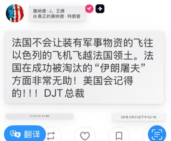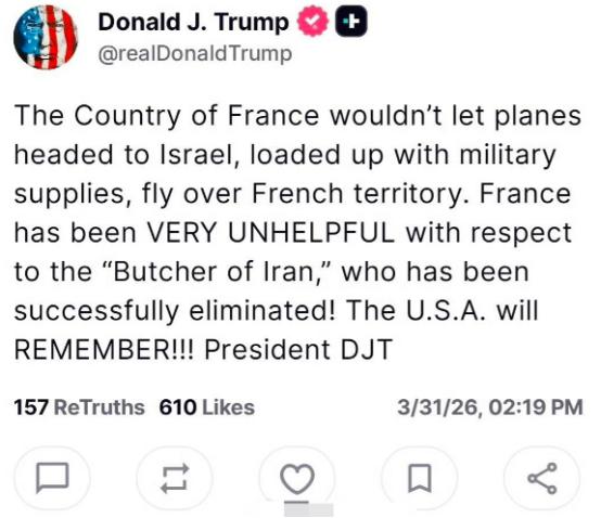 美国陷入了墙倒众人推的局面!特朗普表示:我记下了! 继西班牙、土耳其和意大利之后,如今法国也禁止美国军机在其领空飞行。 特朗普发帖抱怨道:“法国不愿协助美国,反而站到伊朗那边,实在令人失望,美国记下了。” 可能很多人看了会懵,法国不是美国的北约盟友吗,怎么突然就跟美国唱反调了。 这里得先澄清一个关键信息,法国军方消息人士已经明确否认限制所有美国军机飞越领空。 该消息人士表示,目前美法双方相关安排没有发生任何变化。 按照现行规定,美国只有执行后勤运输任务的飞机能在法国降落,这些航班主要使用伊斯特尔和阿沃尔两处空军基地。 特朗普吐槽的,其实是法国不允许装载军用物资、飞往以色列的美国飞机飞越其领土。 而且特朗普还特意强调,法国在对伊朗的军事行动上表现得极不配合,才撂下了“美国记下了”这句硬话。 爱丽舍宫对特朗普的指责感到十分惊讶,他们明确表示法国自始至终都没有改变立场。 法媒此前就报道过,美军支援类军机早就获准进入法国南部伊斯特尔空军基地,但有个前提,相关军机不能参与美国在伊朗境内的军事行动。 这就不是法国突然翻脸,而是法国一直都有自己的底线,没打算跟着美国趟伊朗这趟浑水。 大家可以回顾一下,这已经不是第一个拒绝配合美国的盟友了。 西班牙早就拒绝美军使用其基地开展攻击行动,土耳其和意大利也先后在军事合作上对美国亮起红灯。 意大利甚至直接卡住了美国计划使用的西西里岛锡戈内拉基地,理由就是美国事先没打招呼、没申请授权,也没通知北约体系。 这些盟友的态度转变,其实早就有苗头,不是一时兴起。 特朗普上台后,对欧洲盟友的政策就带着明显的冲突性,凡事只讲美国利益,根本不考虑盟友的感受。 之前特朗普就多次抱怨北约盟友防务支出不够,还威胁说如果盟友不协助美国打通霍尔木兹海峡,北约就会面临非常糟糕的未来,甚至直言退出北约“值得考虑”。 这种强硬施压不仅没让盟友妥协,反而让欧洲各国越来越反感。 欧洲国家现在越来越看重战略自主,不想再把自身安全完全绑定在美国身上。 尤其是这次美国针对伊朗的军事行动,事先根本没和欧洲盟友充分沟通,很多国家都是事后才被动得知消息。 欧洲各国心里都清楚,一旦卷入对伊战争,不仅要承担军事风险,还要面临能源价格波动带来的经济冲击。 霍尔木兹海峡一旦局势紧张,油价就会暴涨,而欧洲高度依赖海湾地区的能源,这种损失他们承受不起。 所以欧洲各国的选择都很现实,不公开反对美国,但也绝对不陪美国冒险。 特朗普的愤怒,其实是在掩盖美国对盟友控制力下降的事实。 他以为靠一句“美国记下了”就能施压盟友,却没意识到,盟友们已经不再像以前那样无条件服从美国。 近年来的民调显示,欧洲民众对美国的信任度已经跌至新低,很多欧洲人都觉得美国是个反复无常的伙伴,不再是可靠的守护者。 美国一直奉行“美国优先”政策,动辄就对盟友挥舞关税大棒,甚至会因为自身利益限制盟友的武器出口。 法国之前就有过被美国牵制的经历,法国想向埃及出口“斯卡普”巡航导弹,就因为导弹里有一个美国零件,被美国直接阻止。 这种被美国摆布的滋味,法国早就不想再忍受,这也是他们这次坚持底线的重要原因。 现在的美国,看似还是超级大国,实则已经陷入了墙倒众人推的困境。 特朗普嘴上说“记下了”,可他根本没有有效的办法让盟友妥协。 美国现在面临多线压力,中东、俄乌、印太各个方向都需要资源和盟友支持。 可盟友们都开始各算各的账,不再愿意替美国兜底,美国的战略空间正在不断被压缩。 说白了,这不是盟友们忘恩负义,而是美国自己透支了多年积累的盟友信任。 美国一直把盟友当成自己的工具,只讲利益不讲情义,久而久之,自然没人愿意再真心配合。 特朗普的那句“我记下了”,更像是一种无力的宣泄,根本改变不了美国盟友离心离德的现状。 后续随着对伊局势的发展,说不定还会有更多盟友站出来,拒绝配合美国的单边行动。 毕竟没有哪个国家愿意为了美国的利益,牺牲自己的安全和经济利益,这就是最现实的道理。