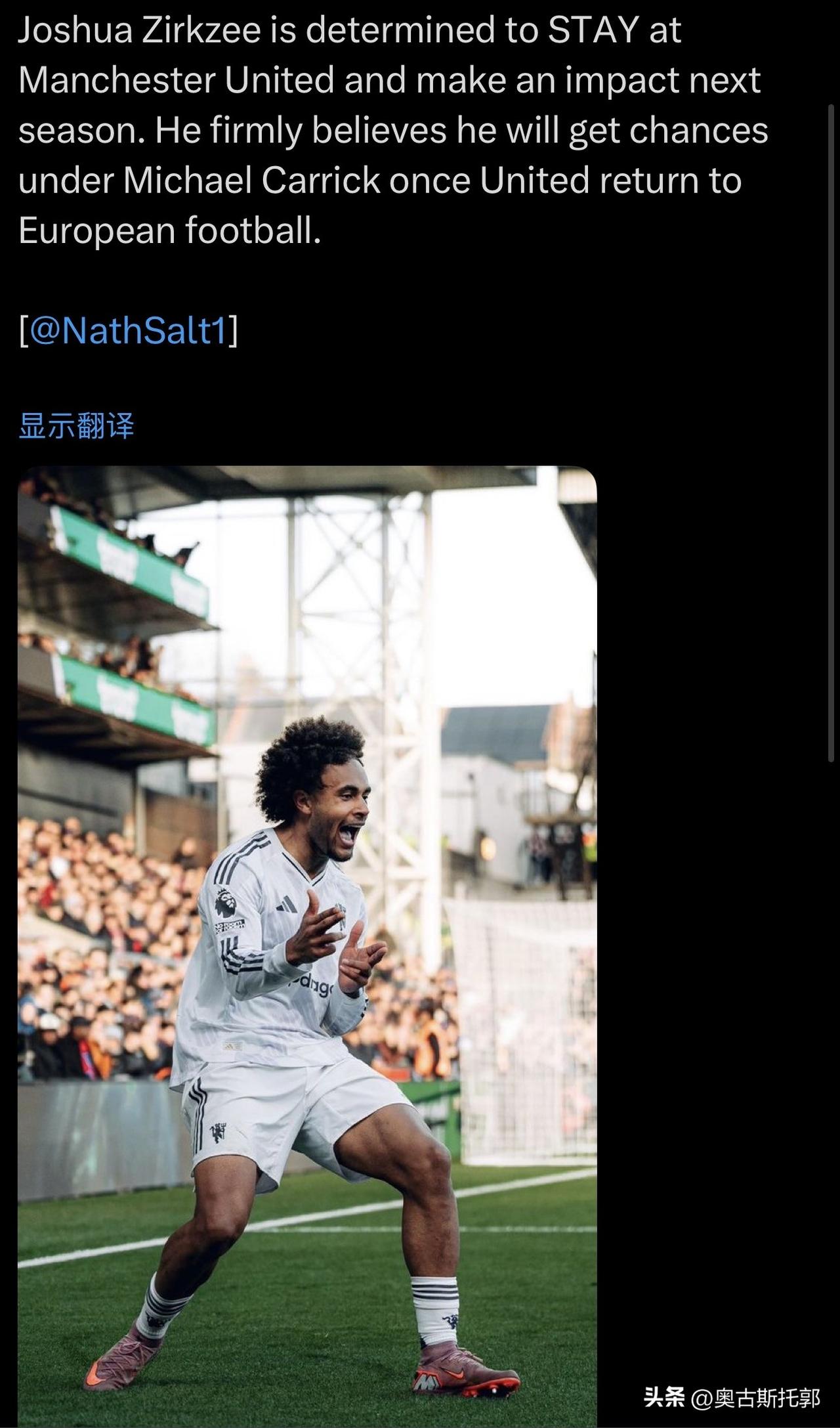 无语了,曼联这是自己给自己抬价吗? 捂盘稀售[呲牙] ……………………………………………………………… 约书亚·齐尔克齐决心留在曼联,并在下赛季有所作为。他坚信,一旦曼联重返欧战赛场,他将在迈克尔·卡里克麾下获得机会。