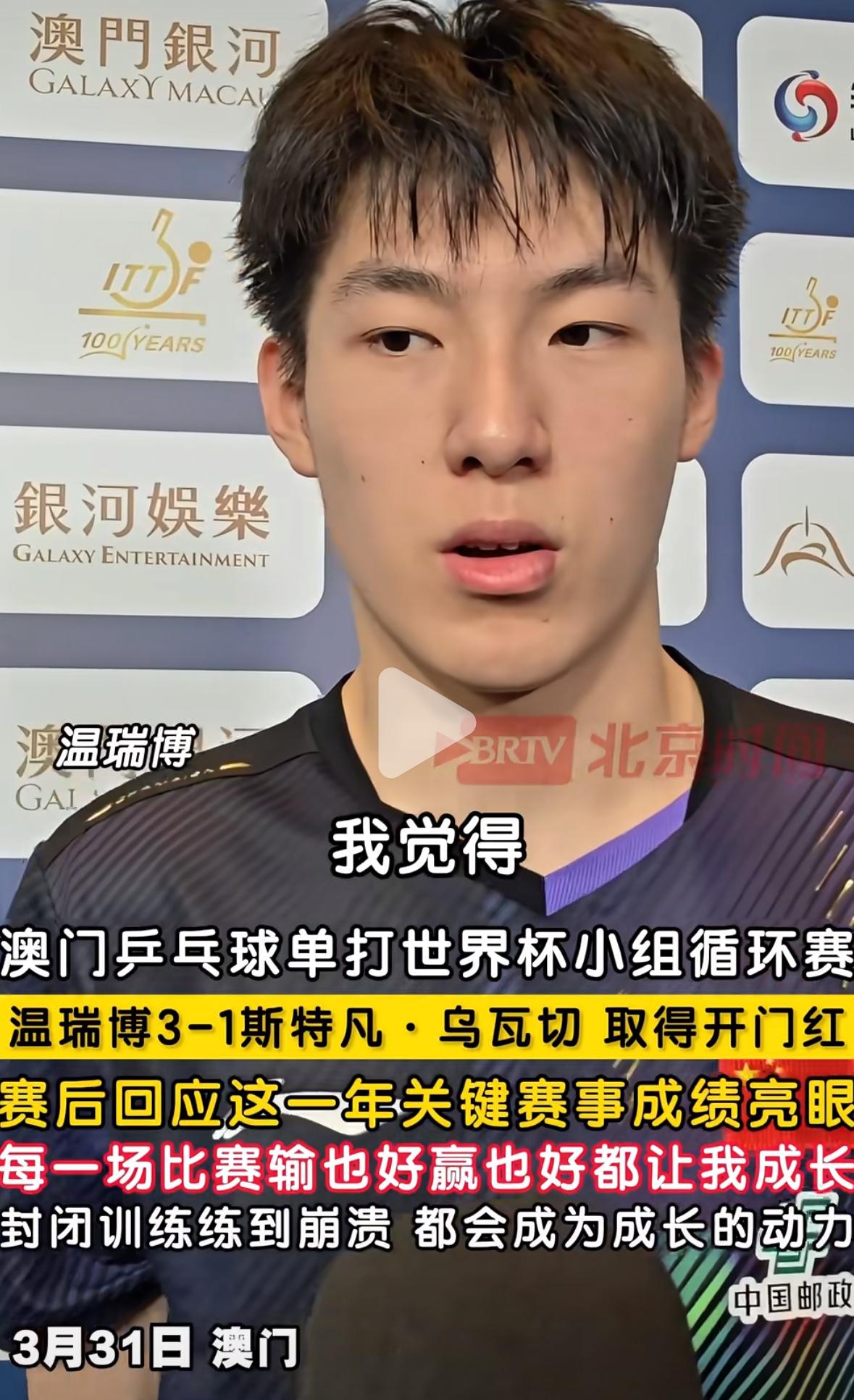 小将温瑞博世界杯首秀,王励勤主席和教练组都来考察他! 世界杯小组赛温瑞博首秀3:1对手, 打得特别好,有冲劲,热血青年, 打球很有观赏性,全台跑, 又帅又猛! 比赛前,教练组就会预料到, 这个西方选手会给小温无限放高球, 看看小温是怎么化解的, 果然把对方化解的很崩溃, 也是看看温瑞博第一次参加世界杯, 心理素质怎么样, 有没有什么不足, 在接下来对阵西蒙高茨怎么指导他!