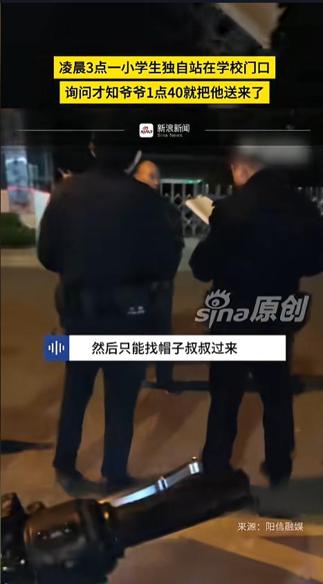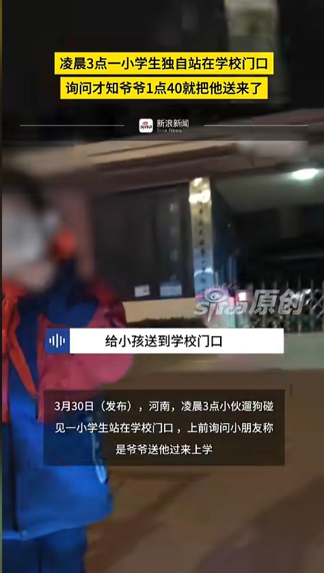 “凌晨三点就站校门口!”近日,河南,一小伙凌晨三点,骑电动车遛狗,路过学校门口时,发现有个小学生站在门口,周围也没有大人。他有些担心就上前询问,竟是被爷爷送来上学的,已经在门口等了一个多小时了!网友:这家长糊涂啊! 接送孩子上学是让家长很头疼的一件事,尤其是自己的上班时间跟孩子的上学时间还冲突着的时候,很多时候没办法,只能早早送去,或者是让孩子的爷爷奶奶帮忙。 据媒体3月31日报道,该男子以前在这个学校带过体育课,也算是学校老师。事发当日,凌晨三点多的时候,他骑着电动车遛狗,恰好路过校门口,结果就发现有个小学生站在那儿,旁边也没有个大人。 男子担心小朋友的安全,就上前询问,得知他是被爷爷送来上学的,1点40的时候就给送来了,光搁校门口,就已经等了一个半小时了。 交谈之中,男子还得知,小朋友的爷爷已经80多了,跟人沟通比较费劲。没办法,他就在旁边先陪着小朋友,然后报了警,等着警察过来处理。 网友看后表示,这孩子的父母也太不负责任了,哪怕是平时让爷爷奶奶接送,也该过问一下吧,怎么能凌晨就给送过去呢?正是该睡觉的时候,让孩子一个人站在门口,出点事情怎么办?家长一定得进行反思了!自己的监护职责不是想扔就扔的! 信息来源:《凌晨3点一小学生独自站在学校门口,询问才知爷爷1点40就把他送来了》新浪新闻
