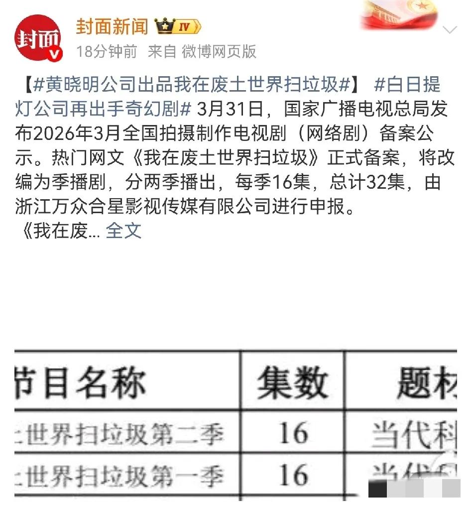 黄晓明深夜官宣!不演戏改当老板,妈妈控股公司再拿爆款网文! 家人们谁懂啊!31号深夜黄晓明突然空降热搜,不是新剧官宣也不是综艺路透,而是直接甩出个大动作——他当出品人的公司拿下了网文圈顶流IP《我在废土世界扫垃圾》影视化版权! 这波操作直接炸锅书粉圈,毕竟这本可是废土无限流大女主的宝藏文,自带百万粉丝基础,能影视化本身就够让人激动,没想到背后操盘手还是黄晓明,这跨界也太稳了! 重点来了!这部剧可不是随便拍拍,直接定了季播模式,两季总共32集,每季16集,看得出来是想好好做精品剧的节奏~ 而申报的公司浙江万众合星,来头更是不一般,居然是黄晓明妈妈张素霞控股的,晓明哥自己还是核心出品人,妥妥的家族式影视布局啊! 之前爆火的古装奇幻剧《白日提灯》就是这家公司出的,口碑热度双丰收,现在又拿下热门网文IP,这眼光也太毒了! 剧情设定也超带感!女主祝宁本来是丧尸世界的强悍战士,一穿越成废土底层五等公民,靠扫垃圾为生还挖出世界隐秘,废土科幻+无限流+大女主,这设定直接戳中爽点,很难不期待! 不过网友更好奇的是晓明哥的事业走向,这几年明显减少台前演戏,反倒在影视投资、出品领域频频发力,从《白日提灯》到现在的废土IP,一步步扩大影视版图,这是彻底转型当幕后老板的节奏? 从演员到出品人,黄晓明这步棋走得太清醒了,手握优质IP+靠谱制作公司,坐等这部废土大女主剧爆火! 黄晓明