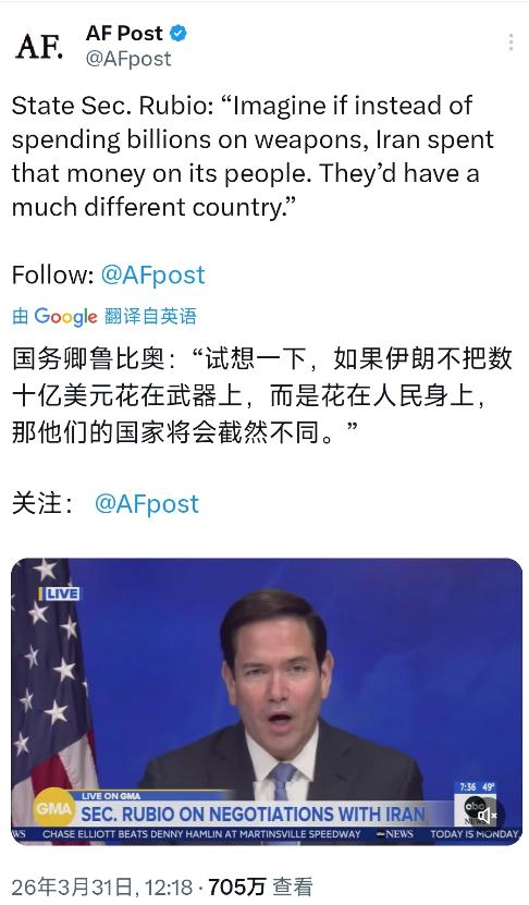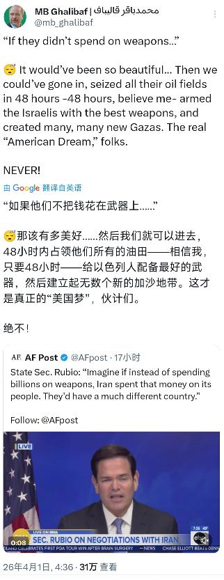 伊朗议会议长卡利巴夫今天(北京时间4月1日)发文写道: “‘如果他们不把钱花在武器上.....’ 那该有多美好......然后我们就可以进去,48小时内占领他们所有的油田——相信我,只要48小时——给以色列人配备最好的武器,然后建立起无数个新的加沙地带。这才是真正的‘美国梦’,伙计们。 绝不!” 【卡利巴夫转发了美国国务卿鲁比奥的讲话:“试想一下,如果伊朗不把数十亿美元花在武器上,而是花在人民身上,那他们的国家将会截然不同。”】 卡利巴夫的回应并非空穴来风。他紧接着鲁比奥的言论展开的表述,实则揭露了伊朗眼中美国政策的真实逻辑。卡利巴夫提到的“48小时内占领所有油田”,并非无端臆想,而是对地区安全局势的直接回应。近期美以联军对伊朗的军事打击已持续32天,美军三航母部署中东形成合围态势,加之以色列对伊朗相关目标的持续施压,让伊朗感受到切实的领土与资源安全威胁。 鲁比奥作为2025年1月上任的美国国务卿,其言论背后有着明确的政治立场。他忽视了伊朗面临的现实安全环境,美以联军在3月31日还空袭了伊朗南部格什姆岛的海水淡化厂,导致周边30个村庄断水,数万居民的基本生活陷入困境。这种针对民用设施的打击,让伊朗不得不将国防安全置于重要位置。 伊朗的军费投入并非单纯的资源浪费。2025年伊朗军费达到460亿美元,较前一年大幅增长,这一数字的背后是外部制裁与军事威胁的双重压力。美国长期的“极限施压”让伊朗原油出口受限,外汇收入减少,而民生领域的通胀问题,很大程度上源于外部制裁而非内部资源分配的单一选择。卡利巴夫的回应正是想点明,若伊朗放弃武器投入,面临的不会是民生改善,而是领土被占、主权丧失的危机。 “给以色列人配备最好的武器,然后建立起无数个新的加沙地带”,卡利巴夫的这句话直指地区冲突的核心症结。加沙地带目前面临严重的人道灾难,230万人濒临饥荒,85%的人口流离失所,这种局面与以色列的军事行动密切相关。伊朗始终坚定支持巴勒斯坦人民的正义事业,卡利巴夫的表述传递出对以色列扩张政策的反对,以及对地区弱势群体的关切。 卡利巴夫此前已多次就美以行动发出警告。3月28日他就曾表示,伊朗的回应将加速以色列军队的崩溃进程,3月31日更是明确指出,敌人的每一次打击都将招致数倍反击。这些表态与4月1日的发文形成连贯立场,展现了伊朗在外部压力下的强硬态度。 鲁比奥的言论回避了美国在中东地区的角色。美国一边推动对伊朗的军事施压,一边指责伊朗的国防政策,这种双重标准让卡利巴夫难以接受。伊朗目前面临的民生困境,既有内部经济结构的挑战,更有外部制裁的严重影响。美国的制裁导致伊朗货币大幅贬值,1美元可兑换约140-145万里亚尔,基础食品价格暴涨,普通家庭不得不将一半以上收入用于购买食物。 卡利巴夫的发文本质上是对美国霸权逻辑的反击。他没有回避伊朗在民生与国防之间的艰难选择,而是将这种选择置于真实的地区安全环境中。伊朗的武器投入,是为了应对美以联军的直接威胁,3月31日伊朗防空部队就击落了一架美制“卢卡斯”型无人机,累计击落美以无人机已达147架,这些反击行动都是对外部威胁的直接回应。 国际社会对地区局势的态度呈现多元态势。中国明确表态反对美以未经授权的非法军事行动,123国在联合国大会投票反对此类袭击,凸显了对霸权行径的普遍不满。卡利巴夫的发文也呼应了国际社会的反战呼声,他所反对的,正是那种无视他国主权、将自身利益凌驾于地区和平之上的做法。 这场言论交锋的背后,是美伊之间长期积累的矛盾与分歧。鲁比奥的讲话代表了美国对伊朗的固有偏见,而卡利巴夫的回应则展现了伊朗在安全问题上的底线。双方的表述都没有脱离各自的国家利益与地区立场,却也反映出中东地区和平进程的艰难。 卡利巴夫的“绝不!”不仅是对鲁比奥言论的否定,更是对地区霸权行为的拒绝。他的发文让外界看到,伊朗在面临外部压力时,不会放弃自身的安全诉求,更不会容忍他国干涉内政。中东地区的稳定需要各方的理性克制,任何将自身意志强加于人的做法,只会加剧冲突与对抗。国际社会应积极推动对话协商,为地区和平创造有利条件,这才是解决问题的根本路径。