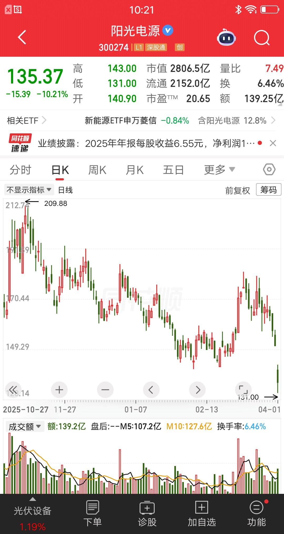 一位河南的股民,今天在132元也就是跌幅12%的位置,买了阳光电源的股票。然后他在社区晒图并分享自己的逻辑。 他是昨天看到阳光电源的业绩很炸裂,就把股票加入自选了,想看看股价会如何反应。结果集合竞价就大跌了6.54%,竞价跑了7.19亿资金,看来是不及预期或者是利好兑现,有部分资金获利了结了。 他想到一句话,别人恐惧我贪婪,现在阳光电源大跌而人气又极高。如果开盘后再杀跌的话,那就是抄底的时候了。 果真如他所愿了,开盘后继续杀跌,而且跌速很快。他眼疾手快,在大跌12%的位置买到了,价格是132元。至于买了多少金额,他并没有写出来。 有人夸他有逆向思维,理解力很强。有人说他就是在臆想,就算买对也是蒙对的。 他是对是错,目前还没有结论,不过他的逻辑可以讨论一下,真心希望这位股友能赚到钱,毕竟他也是众多散户的一员。