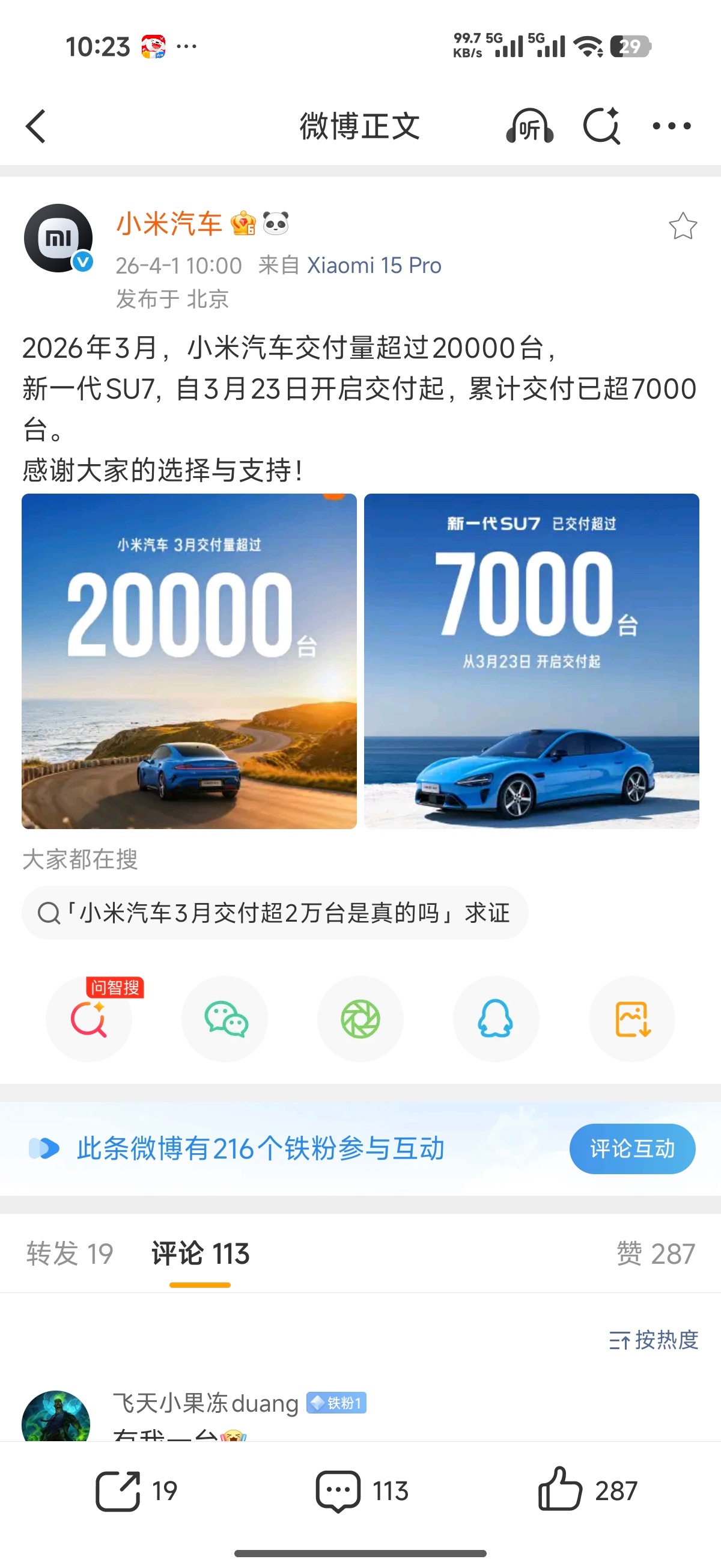 总的来说,三月份单单2w+交付平平无奇,但su7首周交付7000那就不同凡响了,下个月三万问题不大。