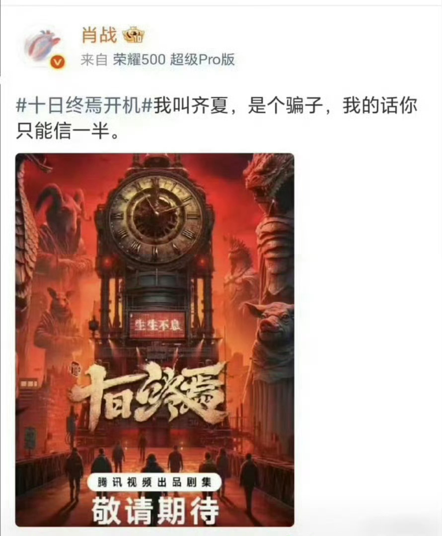 肖战提前发博预热《十日终焉》了仅好有可见nice👏齐夏:我从来不信命,我只信我自己。我齐夏,这辈子只认一个理:谁护我,我护谁;谁害我,我灭谁。我可以忍,但我有底线,触碰到了,就别怪我不留情面。只要我还站着,就没人能判我输。 十日终焉三羊开泰