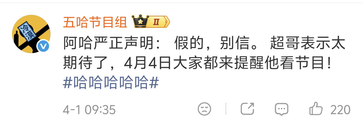 邓超是来给官宣的吧,说着4.4播不了其实就是4.4五哈就要播出了吧五哈4月4日播