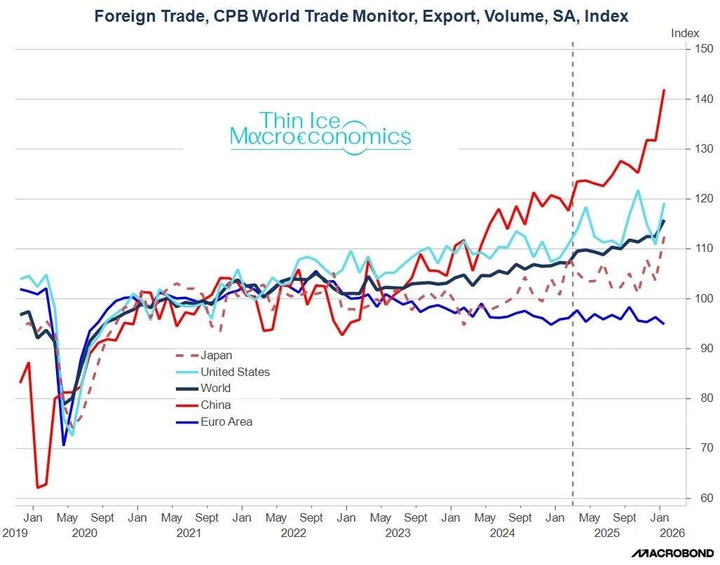 前欧洲央行经济学家Spyros Andreopoulos发文称,中国出口在特朗普关税之后表现“惊人”。图表显示,中国出口量指数自2025年以来明显上升,涨幅领先全球、美国、日本和欧元区。 图片来源于网络