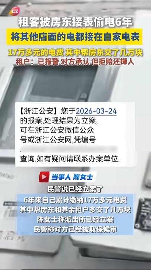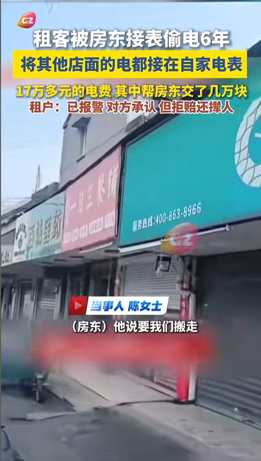 “离了个大谱!”近日,浙江海宁,一女子突然发现,自家电表上竟接上了其他家的线,还是房东背着自己偷偷干的,6年来给别人白白交了几万块电费。房东对此大方承认了,但就是不赔,还让她到期搬走!网友:恼羞成怒了? 租个地方做生意,房东的人品怎么样很重要,遇到一个好房东,省心省力,做起生意来都感觉顺畅不少,可要是遇见个坏房东,那可遭老鼻子罪了。 据媒体3月30日报道,陈女士为了做生意,租了一家沿街的店面,六年多了,光电费就交了17万多。她一直也没觉得什么,直到最近自己去查看电箱。 这时候她才发现,自家的电表下面,竟然还连着其他户的线,都是这个房东租出去的店铺,还有根就是房东自己的。陈女士气愤之下,找房东理论。对方承认了,就是他偷偷干的,但是不愿意退钱。 一想到这么多年给别人白交了几万块,陈女士就难受,直接报了警。警方也立了案,房东也被取保候审了。但糟心事接着又来了。 这个店面今年五月份合约到期,房东竟然让她到期就搬走。可是搬一个店面的成本,实在是太高了。对方又说,不想搬也行,先把案子撤了,然后再谈! 网友看后表示,这不就是赤裸裸的威胁么?不管这件事怎么处理,这个生意是做不安稳了! 信息来源:《租客被房东接表偷电,6年累计缴纳17万多元电费,其中帮房东和其余租户多交了几万块,对方承认但拒赔。》广州ing