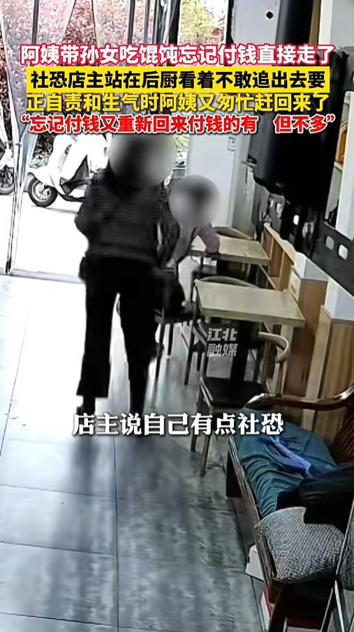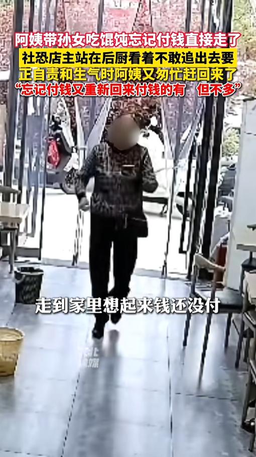 “看人社恐好欺负?”近日,安徽,一位阿姨带着孙女到店里吃馄饨,结果吃完之后,没付钱就走了。店主看到后,因为社恐,也没敢追去要,只能自己一个人生闷气。没想到,十几分钟后,阿姨又火急火燎的跑回来付钱了!网友:误会了! 据媒体3月30日报道,李先生开馄饨店十多年了,自己一直有些社恐。事发当天,这位阿姨带着孙女,来店里点了一份15元的馄饨,吃完没付钱就离开了。 当时店里还有其他客人,加上李先生社恐作祟,他也不敢追出去要,就眼睁睁看着他们走了,自己一个人搁那儿生气自责。李先生说,他之前还发过视频,说自己社恐的事儿,这回倒好,让人家欺负上了。 没想到过了十几分钟,这位阿姨又急匆匆的跑了回来。言说自己大意了,到家才想去没给钱。这时候,李先生还在生闷气呢,听到这儿,更自责了。心里直说,自己太小心眼了。 他说,现在一碗馄饨也没多少钱,一般都要不会赖账。但吃完不付钱的也有,走了又回来付的还真是不多。 网友看后表示,赖账的没有几个,大部分都是真忘了。自己出去吃饭,当时不付,吃饭的时候再玩个手机,一会儿就想不起来付没付了。为了避免这种尴尬,都是先付了钱再吃! 信息来源:《阿姨带孙女吃馄饨忘记付钱直接走了, 社恐店主站在后厨看着不敢追出去要,正自责和生气时阿姨又匆忙赶回来了,店主:忘记付钱又重新回来付钱的有,但不多(来源:@二蛋蛋 )》江北融媒