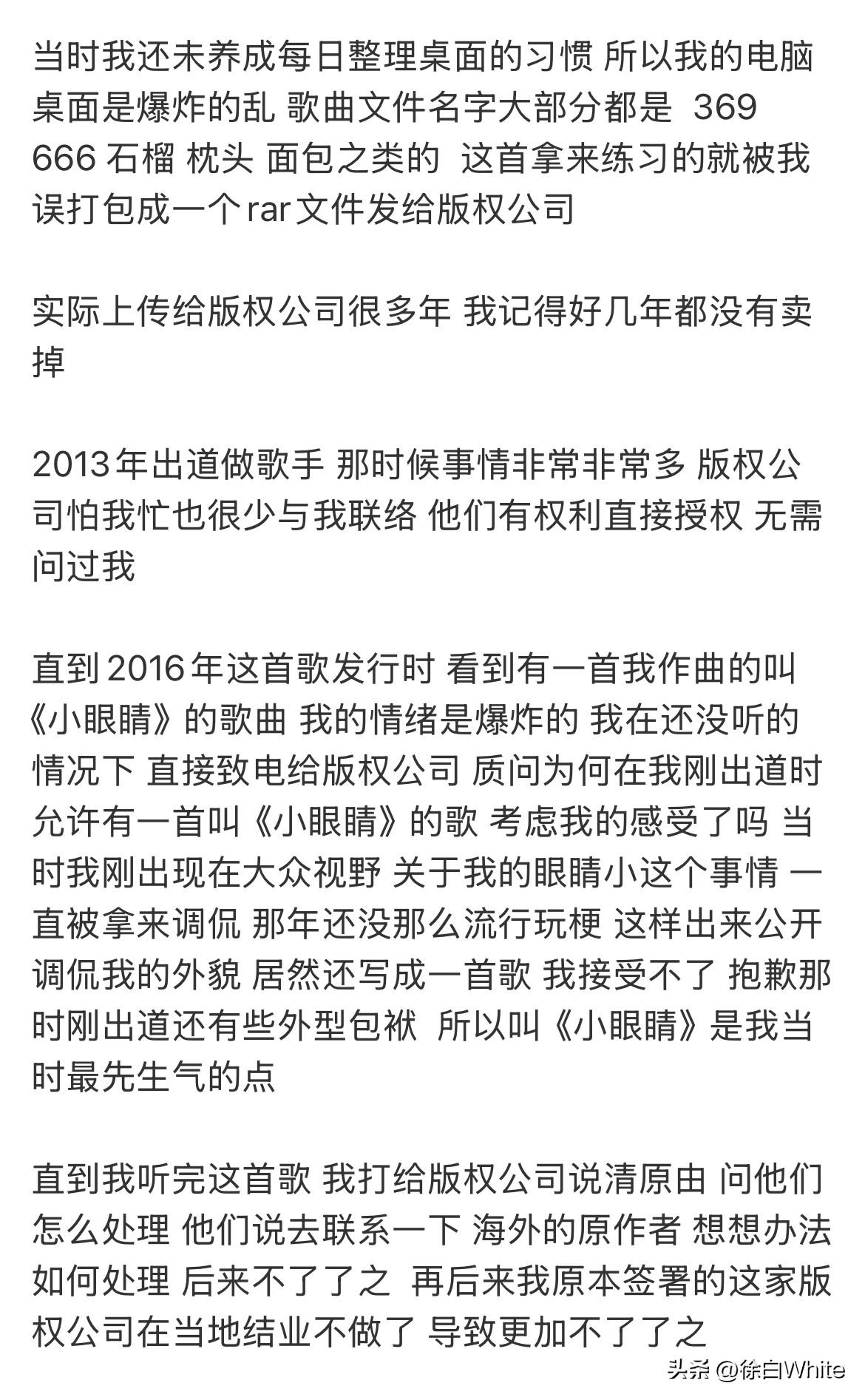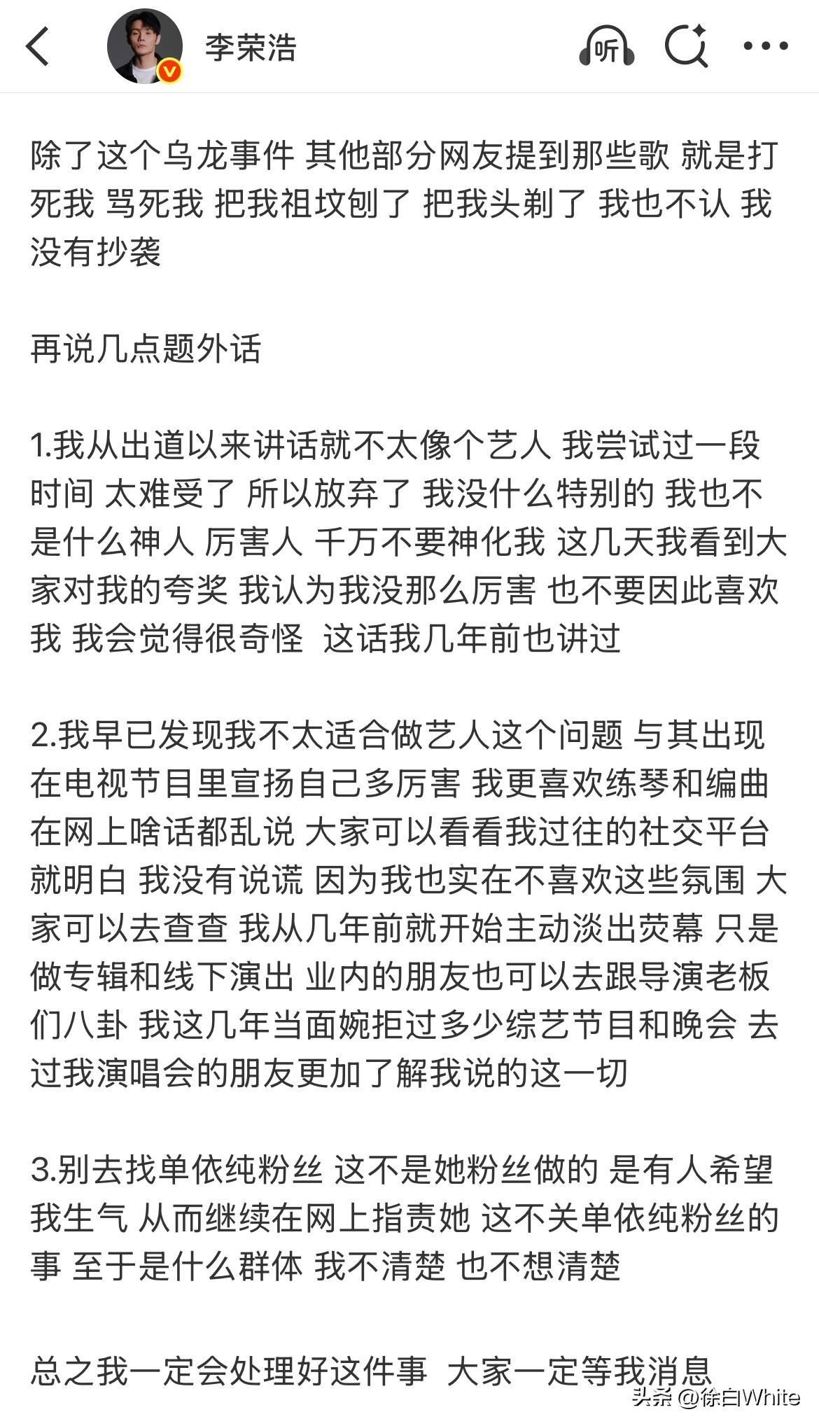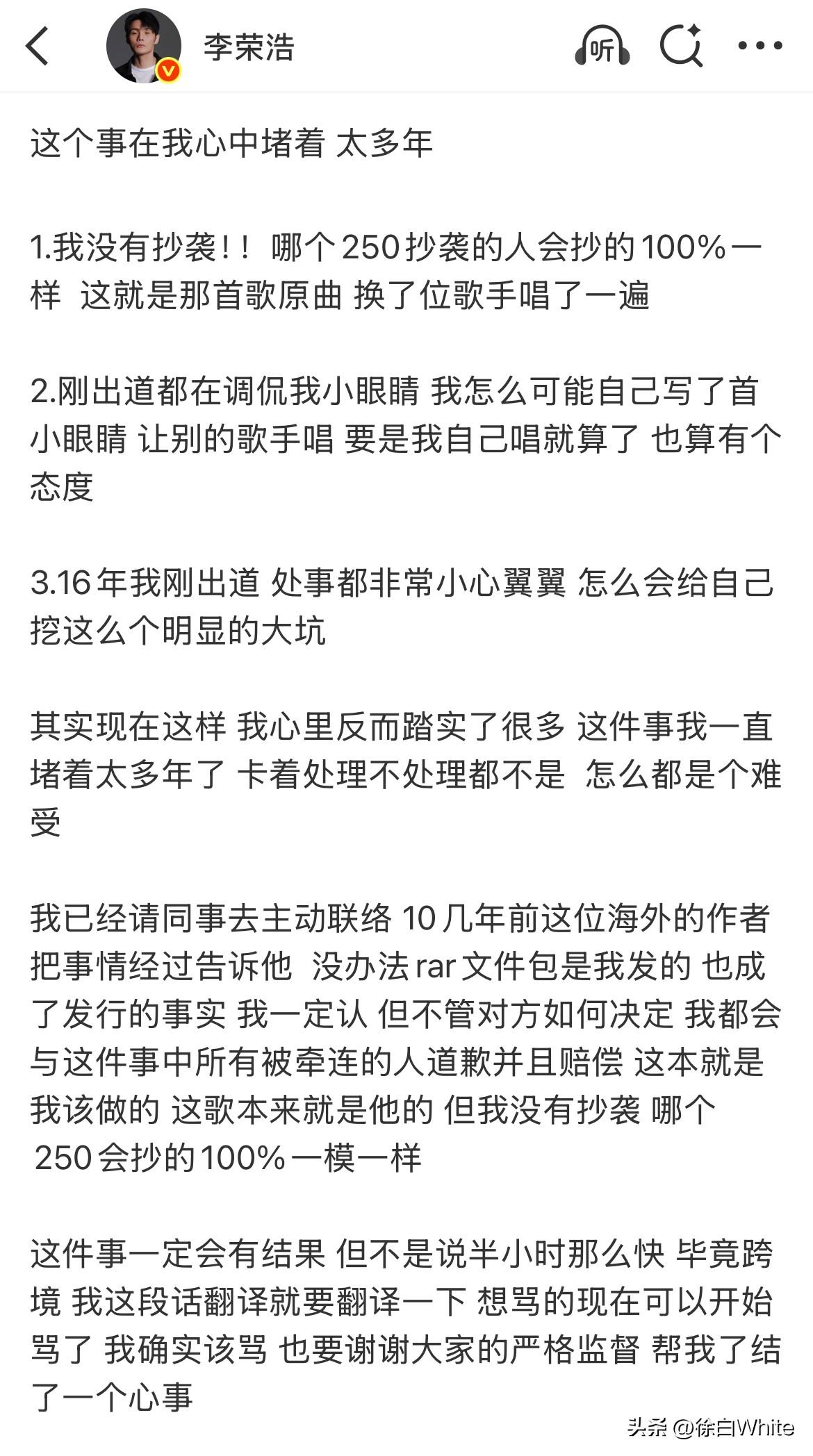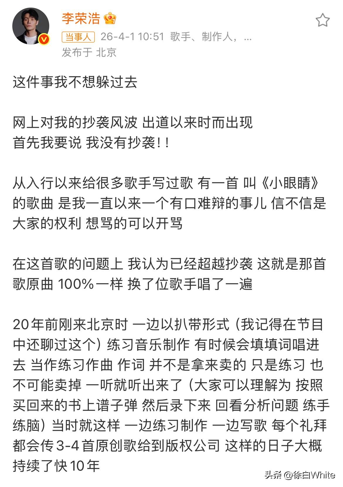 4月1日,李荣浩发长文否认抄袭 一句“哪个250抄袭的人会抄的100%一样”,给我逗笑了,李荣浩称这件事在他心里堵了很多年,《小眼睛》这首歌不是抄袭,而是原曲,只是换了个歌手唱了一遍! 还有一句,出道别人都调侃我眼睛小,我怎么会自己写一首小眼睛,让别的歌手唱?他接受不了这首歌,这首歌也是让他生气的点,这么多年因为一直联系不到原创歌手,导致这件事一直卡在他心里,如今说出来心里通畅了很多,除了这首歌,其他抄袭指控他都不认,另外,李荣浩坦言自己就是一个喜欢音乐的普通人,觉得自己不适合做艺人所以逐渐选择淡出娱乐圈,减少出席活动,最后李荣浩明确表示这是不是单依纯家做的! 不得不说,李荣浩,真的[赞]!