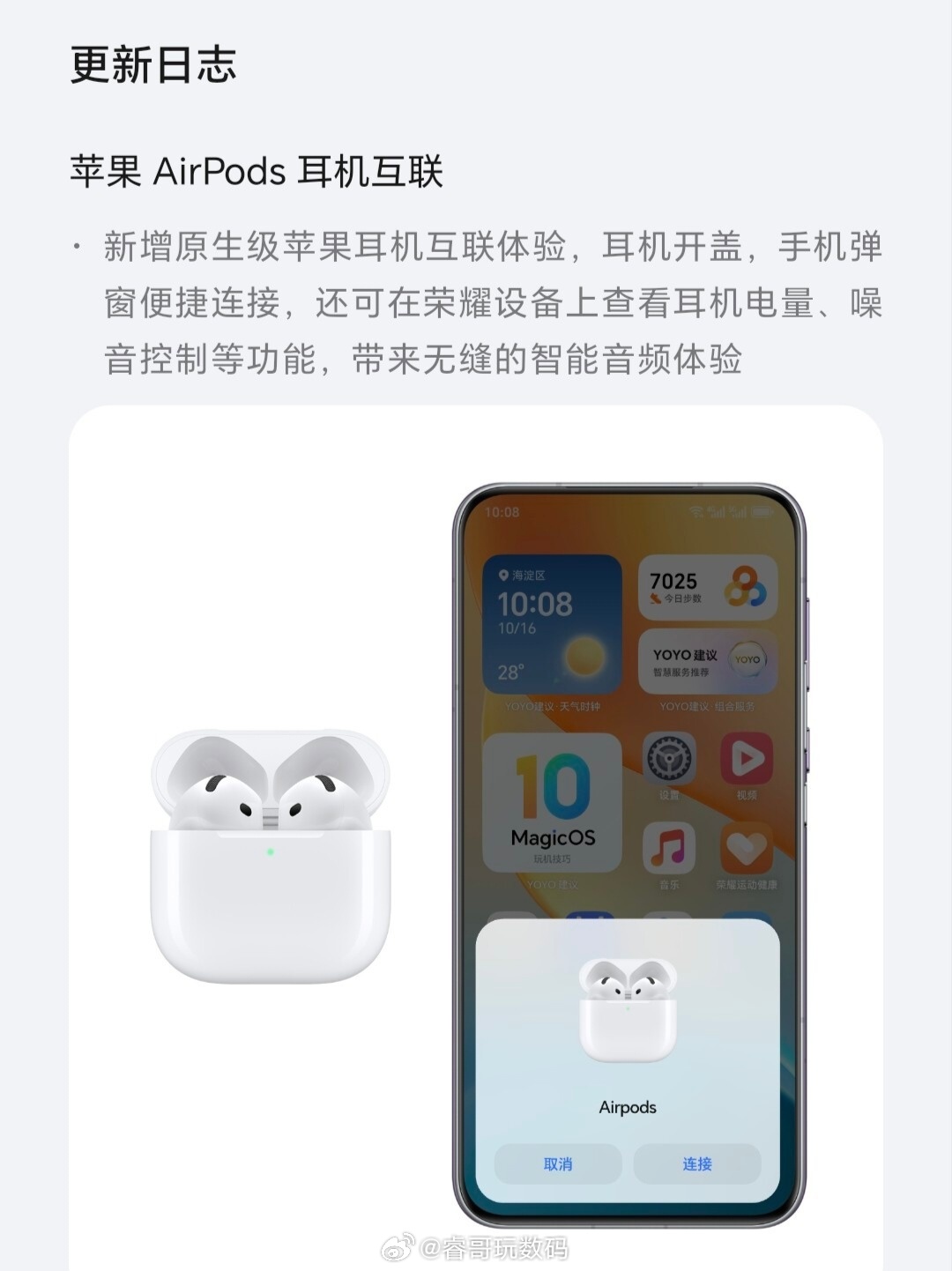荣耀Magic V6 MagicOS 10.0.0.126版本更新来了:1、新增苹果AirPods耳机互联,支持开盖弹窗、电量显示、降噪控制等原生功能;2、AI键自定义新增支持更多功能;3、新增眼动翻页功能;4、新增应用过渡动效自定义功能,舒缓、平稳、高效三种模式可选;5、新增锁屏小组件,第一批支持的锁屏小组件:步数、实况天气、空气质量、紫外线、日程、闹钟、YOYO、电量、微信扫一扫/付款码/乘车码、支付宝扫一扫/付款码/乘车码等20+小组件。正在推进的小组件有:荣耀音乐、笔记、计算器、录音机、计时器、秒表等,其他系统应用和三方锁屏小组件也会持续拓展;6、优化相机拍摄效果、优化续航表现。