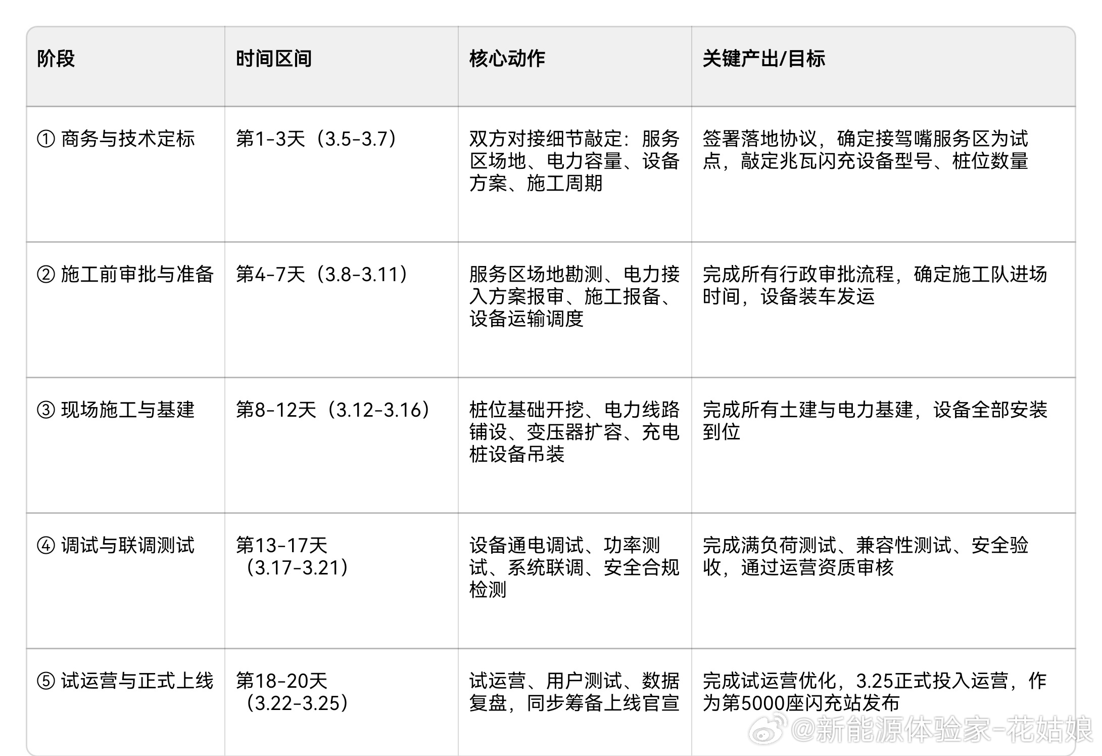 Day 1-3(3.5-3.7):谈定“生死线”核心是敲定「场地、电力、周期」三大关键条件。高服集团作为业主方,需要快速协调服务区场地、电力容量;比亚迪侧同步敲定设备型号、施工方案,3天内完成商务与技术的闭环,为后续抢工争取时间。Day 4-7(3.8-3.11):打通“审批关”服务区施工需要路政、电力、消防等多部门审批,这是传统基建项目最耗时的环节。比亚迪通过标准化的高速站方案,配合高服集团的属地资源,4天内完成所有报备流程,实现“即批即开工”。Day 8-12(3.12-3.16):抢建“硬基建”现场施工是最考验效率的环节:基础开挖、电缆铺设、变压器扩容、设备吊装同步推进,每天24小时轮班施工,5天内完成所有土建与安装,把“不可能完成的施工周期”压缩到极限。Day 13-17(3.17-3.21):通过“验收线”兆瓦闪充设备需要通过满功率测试、兼容性测试、消防与电力验收,同时接入比亚迪闪充平台系统。这一阶段5天内完成所有测试与整改,拿到运营资质。Day 18-20(3.22-3.25):上线“里程碑”试运营3天,完成用户侧的稳定性验证,3.25正式投入运营,实现“20天从对接落地”的行业奇迹。