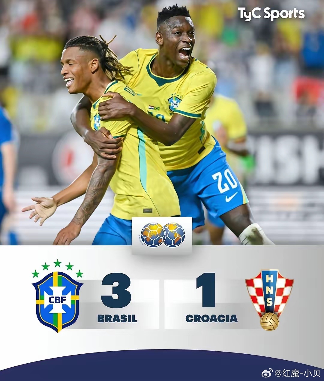 友谊赛:巴西3:1击败克罗地亚北京时间4月1日上午,在美国奥兰多市进行的一场友谊赛中,“桑巴军团”巴西队3:1击败“格子军团”克罗地亚队。上半场补时阶段,巴西队的维尼休斯突入禁区内后回传中路,跟上的达尼洛.奥利维拉推射破门,为巴西队取得领先。达尼洛.奥利维拉去年7月份从英超诺丁汉森林队转会回国内的博塔弗戈队,本赛季巴西足球甲级联赛他在五场比赛中攻入五粒进球,被安切洛蒂看中招入巴西国家队。第84分钟,克罗地亚队的托尼.弗鲁克在右边路送出一记精准长传球,效力于德甲沃尔夫斯堡队的克罗地亚中场洛夫罗.马耶尔在禁区线上倒地铲射破门,将比分扳成1:1平。第88分钟,效力于英超布伦特福德队的巴西中锋蒂亚戈将恩德里克获得的点球罚进,帮助巴西队再次获得领先。24岁身高190cm的蒂亚戈目前在本赛季英超射手榜上,以19粒进球排名第二位,仅次于哈兰德的22球,他能入选巴西队也是实至名归。第92分钟,巴西队发动快速反击,恩德里克将球直传给前锋加布里埃尔.马丁内利,后者突入禁区内射门命中锁定胜局。加布里埃尔.马丁内利效力于英超阿森纳队。足球巴西3比1克罗地亚世界杯
