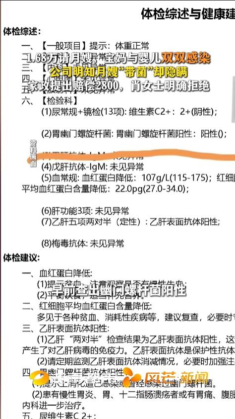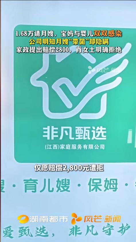 “请了个“瘟神”啊!”近日,江西南昌,一女子为了给宝宝专业的照顾,花费1.68万,从家政公司专门聘请了一位月嫂。不想对方竟是持假报告上岗,公司也帮忙隐瞒,最后导致女子和宝宝均被传染了幽门螺杆菌。网友:必须严查到底! 家政月嫂行业,从业人员的健康必须过关,毕竟请进家来就是为了照顾人的。可有些人竟弄些假报告,欺骗雇主,公司甚至还助纣为虐。 据媒体3月31日报道,肖女士刚生完孩子不久,她花费重金,专门请了一位月嫂,想要给宝宝专业的照顾。没想到,却被欺骗,月嫂竟然携带传染菌,最后婴儿和宝妈双双感染。 原来,这位月嫂之前查出了幽门螺杆菌阳性,一直服药治疗,还没到复查期呢,就弄了一个假的阴性报告上岗了。最气人的事,家政公司明明知道,却依旧选择了隐瞒,没有给肖女士提个醒。 后来,肖女士找到家政公司,面对她的质疑,对方竟全程保持沉默,只愿意赔偿2800元。 在我国,幽门螺杆菌感染率近60%,感染的人多,并不能说明它不致病。相反的,几乎所有感染者都会出现慢性胃炎,除此之外,它还可能导致胃癌。 网友看后表示,家政行业最重要的就是健康,他们明显违背了,得让卫健委等部门好好查查!月嫂、家政公司、出假报的体检机构,一个都不能放过! 信息来源:《1.68万请月嫂,宝妈与婴儿双双感染 公司明知月嫂“带菌”却隐瞒 家政提出赔偿2800,肖女士明确拒绝》风芒新闻