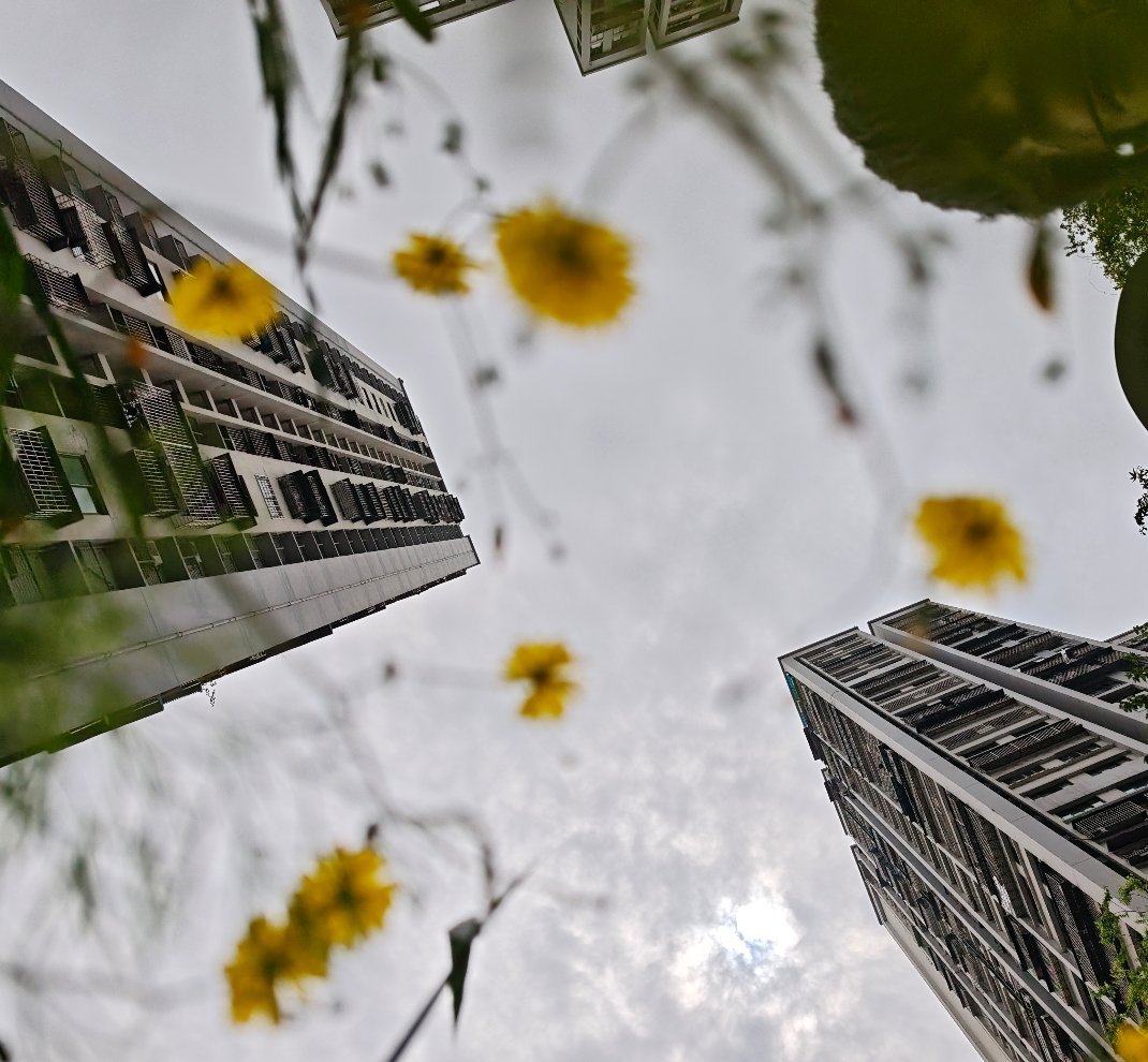 想模仿别人拍从花里看到天空的场景,东施效颦了……那就来个被现代化城市包围的照片吧