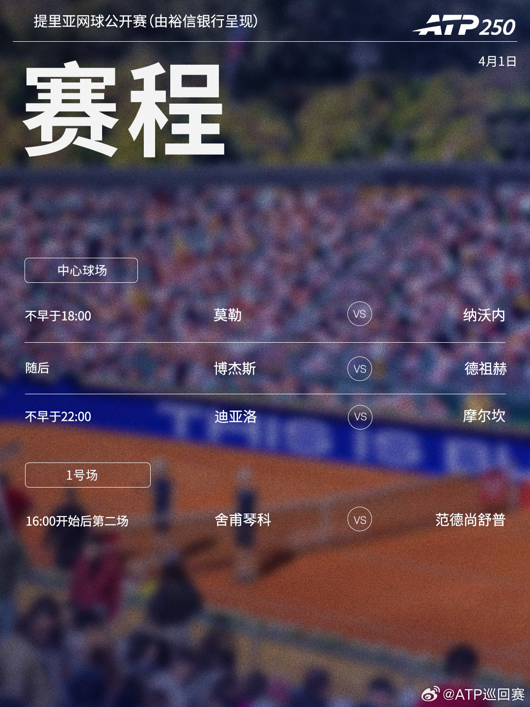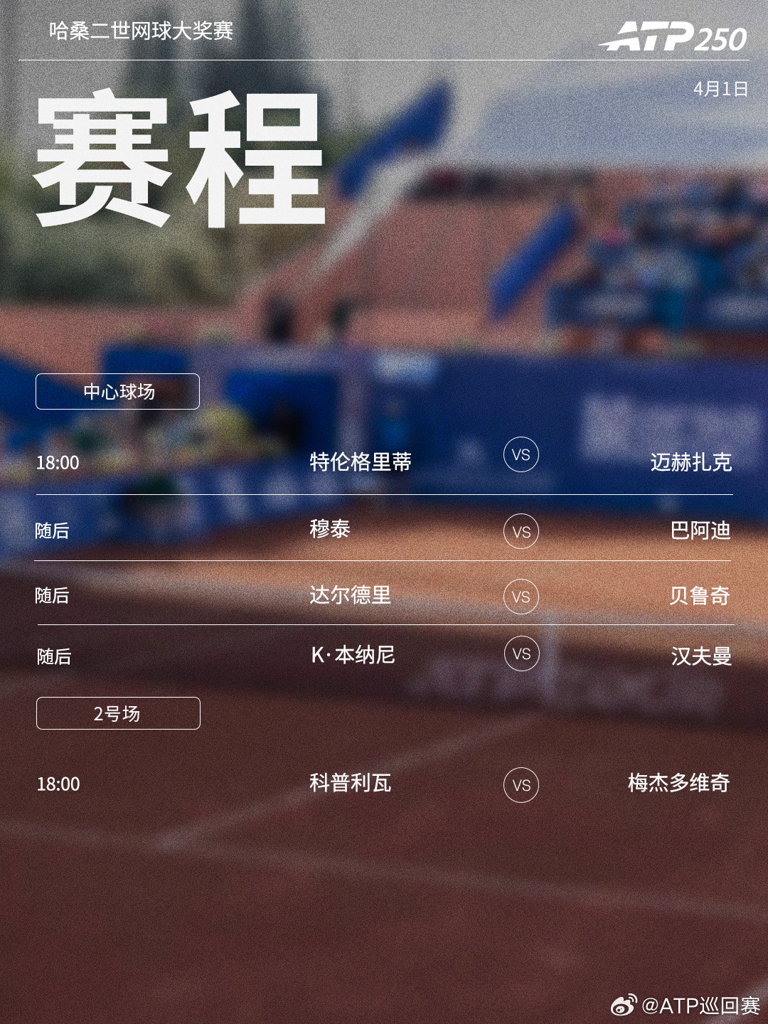 三站ATP250红土赛事第二轮将于周三开打,赛程见图(均为北京时间)👀