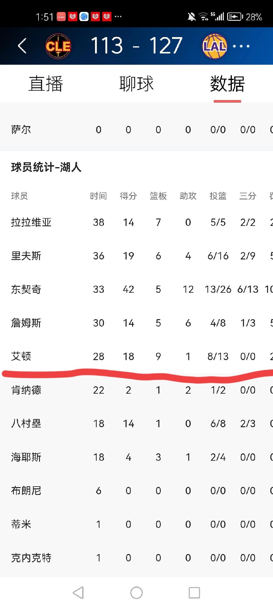 顿宝不再软,湖人队季后赛有戏?! 一向被人诟病的湖人首发中锋艾顿,因打球风格偏软被球迷昵称为“顿宝”。 他的表现,直接决定了湖人季后赛内线能否顶住、球队能走多远。 今天的艾顿给出了答案。 面对骑士队阿伦、莫布里这组联盟一流内线组合,艾顿毫不手软。 全场艾顿出战28分钟,13投8中,罚球3中2,贡献18分9篮板1助攻1抢断,正负值+10,其中还狂抢6个前场篮板。 全场比赛湖人篮板球37-35领先骑士,艾顿功不可没。 这样强硬起来的艾顿,才是湖人球迷想看到的样子,也直接影响着湖人的季后赛走势! 大家伙认为艾顿会是湖人队内线的答案吗?