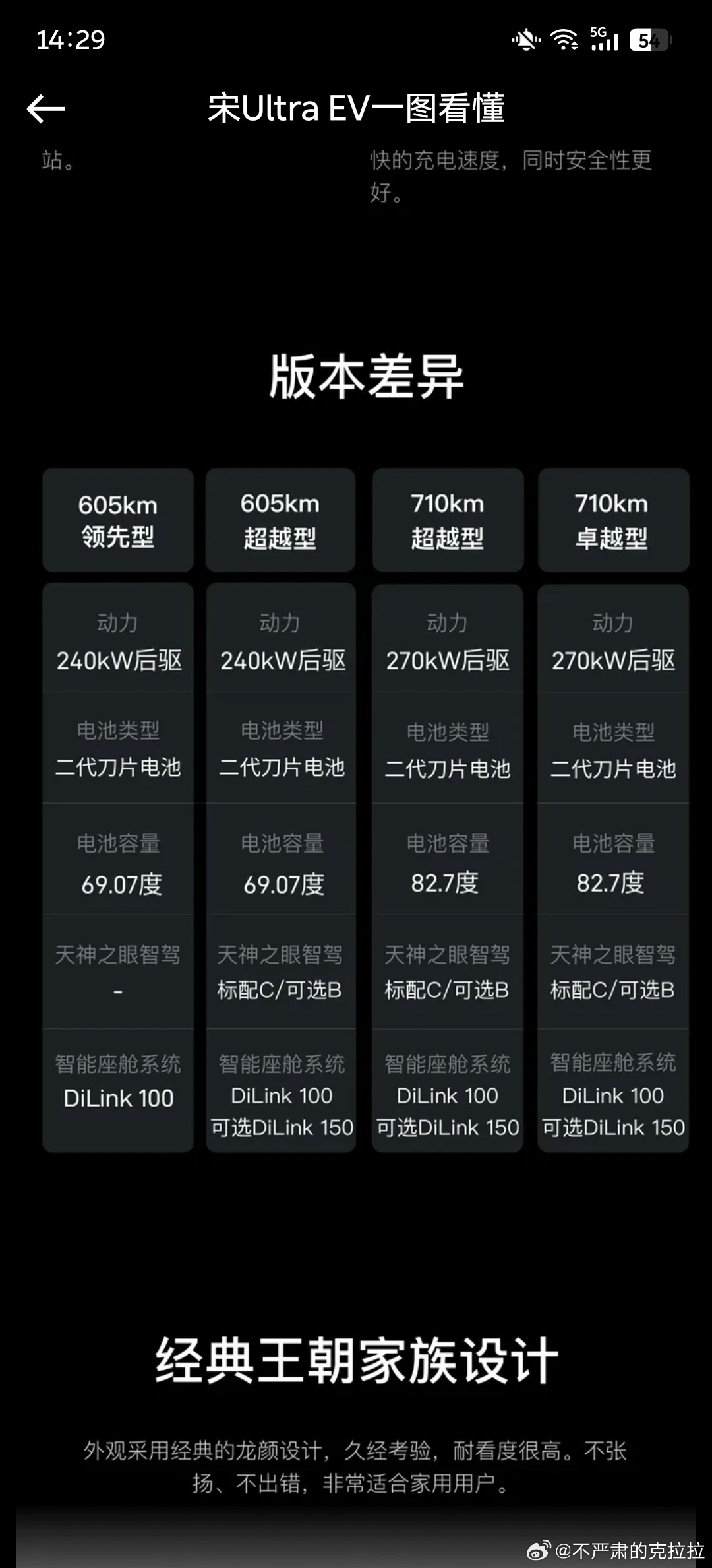 在产品 SKU 的梯队上,宋 Ultra 做到了四个 SKU,我个人觉得家庭用户 605 和 710 都可以,看预算。对于一台家用车来说,这个续航距离完全够了。