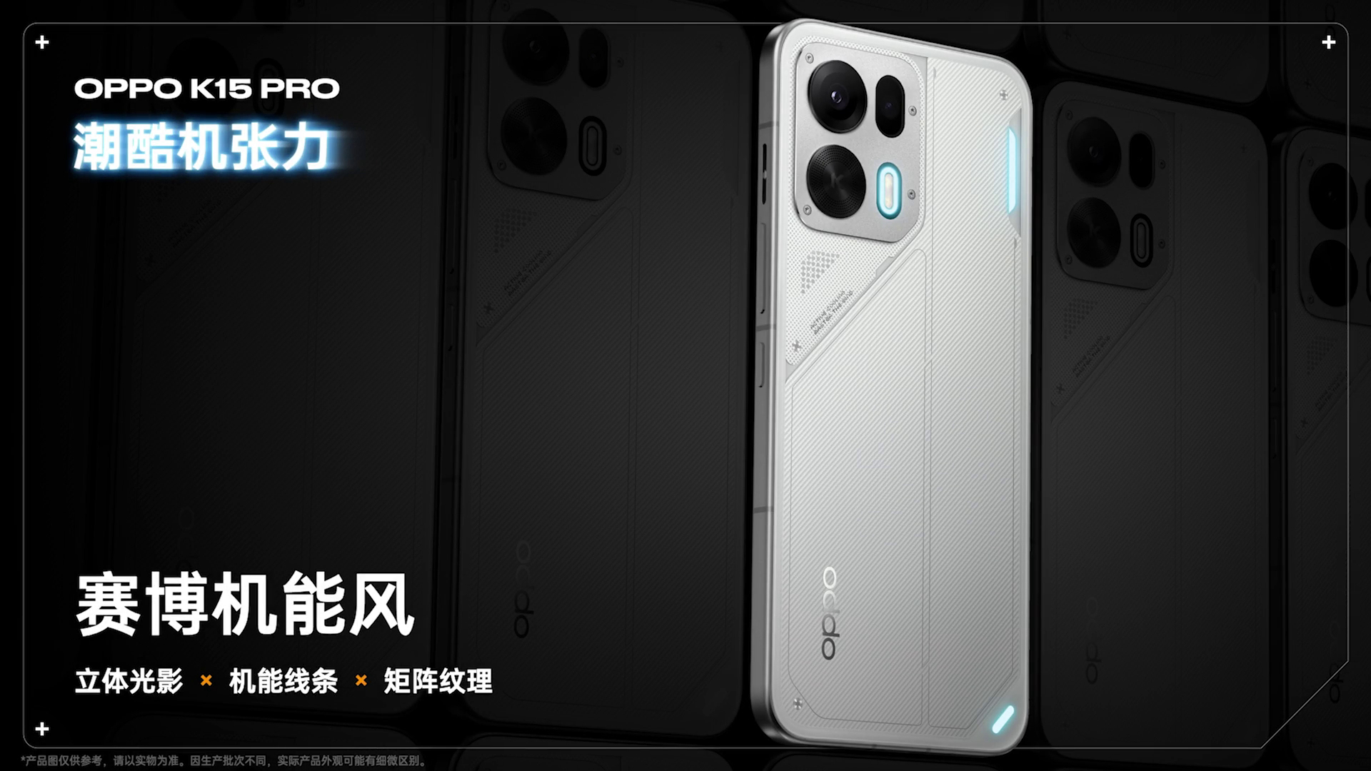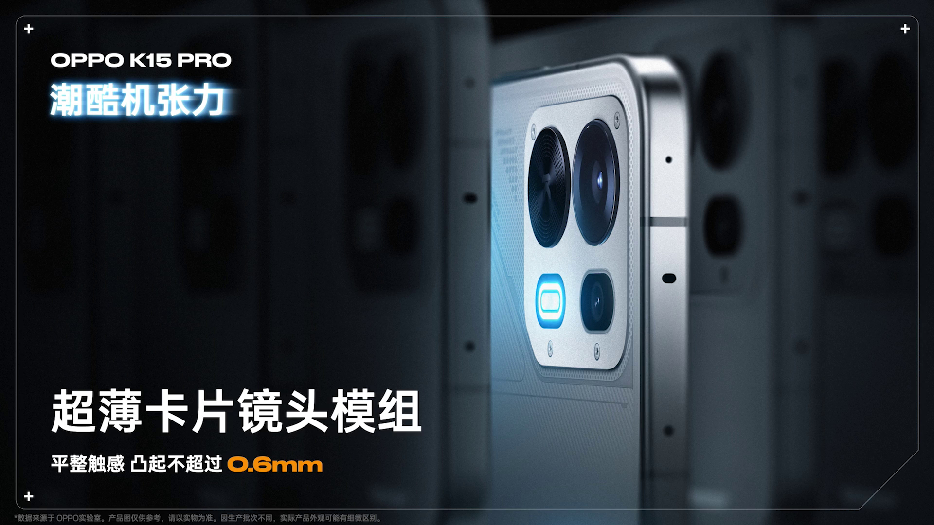 OPPO K15 Pro 系列OPPO K15 Pro 系列后盖上的超薄卡片镜头模组最高凸起仅0.6毫米,一体感超强。并且K15 Pro采用了6.59英寸的黄金尺寸,搭配金属中框,颜值不从众,手感更出众。