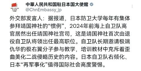 日本还遮遮掩掩,不想正视根本性问题,这一次我们把话挑明了说!4月1日,中国驻日大使馆刊文表示,据报道,日本防卫大学每年有集体参拜靖国神社的“惯例”,2024年前海上自卫队高官居然出任靖国神社宫司,这是靖国神社首次由退役自卫队将领出任最高职位。 这种必然,先从自卫队的思想根基上就能看明白。作为培养自卫队核心力量的防卫大学,早就不是单纯的军事院校,而是成了历史修正主义的传播场。 必修课里公然用“支那事变”“大东亚战争”这类带着侵略烙印的词汇,把当年的侵略战争歪曲成“对欧美列强的自卫”,完全无视亚洲各国人民遭受的苦难。更离谱的是,学校还长期邀请竹田恒泰这类主张参拜靖国神社的极右翼人士当讲师,把极端仇华、美化战争的思想当成“正统”灌输给未来的军官。 这种教育不是一时半会儿的事儿,而是年复一年的渗透,从根源上扭曲着自卫队成员的历史认知和价值观。更让人警惕的是,这种扭曲的教育已经下沉到中小学,防卫省向小学分发带军国主义色彩的儿童版《防卫白皮书》,自卫队在校园里搞“体验活动”,让小学生模仿军事仪式、接触武器宣传,就是想把“强军至上”的观念从小植入孩子心里。 思想上的歪路走久了,体制上的绑定就成了顺理成章的事。靖国神社作为供奉14名甲级战犯、象征军国主义的地方,如今和自卫队的联系已经到了制度化的程度。 2024年4月,前海上自卫队高官大冢海夫出任靖国神社宫司,这是史上首次由退役自卫队将领担任这一最高职位,而神社的顾问团队里,还有多名前自卫队幕僚长坐镇。 这已经不是简单的个人信仰问题,而是自卫队和靖国神社之间搭建起了明确的人事通道,让军国主义的精神符号和现实的军事力量深度捆绑。更别提防卫大学多年来的“惯例”——组织学员长途跋涉去靖国神社“朝圣”,美其名曰“锻炼气魄”,实则是在强化对侵略历史的错误认同。就算有规定禁止集体参拜,陆上自卫队高官率队乘公务车参拜后,也只是轻描淡写的“训诫”了事,这种纵容本质上就是默许。 思想和体制的双重加持下,日本的“再军事化”已经不是停留在口号上,而是实打实的步步推进。防卫预算连续14年上涨,2026财年直接冲到9.04万亿日元的历史新高,在2023到2027财年的五年里,防卫费总额更是计划达到43万亿日元。钱花在哪了?不是防御性装备,而是构建沿岸无人机防卫体系、采购高超音速导弹、改进射程达1000公里的反舰导弹,这些都是具备主动打击能力的进攻性武器。自卫队的改组也透着危险信号,海上自卫队搞“史上最大改组”,新设部队名称里满是“作战”字样,彻底抛弃了“护卫”的伪装,被日本媒体直接点破是“进攻化改组”。 更关键的是,支持修宪的势力已经掌控了众议院2/3以上议席,现行和平宪法里“放弃战争”的核心条款面临被修改的风险,一旦修宪成功,日本自卫队海外作战的法律障碍将被彻底清除,届时日本将彻底打破战后的和平框架。 这些动向不是孤立存在的,而是相互勾连、层层递进的闭环。教材歪曲历史是为“再军事化”铺路,让民众和军人对战争失去敬畏;靖国神社和自卫队的绑定是为了强化军国主义精神认同,凝聚右倾力量;大幅增加防卫预算、推进修宪是为了让“再军事化”有法律和物质支撑。 当思想上的扭曲、体制上的绑定、行动上的扩军形成合力,整个社会的极端情绪就会被点燃,自卫队成员出现持刀闯馆这样的极端行为,也就不足为奇了。 日本这种遮遮掩掩的操作,本质上是想逃避历史罪责,悄悄恢复军事大国地位。但历史的真相不会被篡改,地区国家的眼睛也不会被蒙蔽。自卫队右倾化的每一步,“再军事化”的每一个动作,都是在侵蚀亚太地区的和平根基。 国际社会必须保持高度警惕,因为对侵略历史的纵容,就是对未来和平的不负责任。日本如果继续沿着这条危险的道路走下去,最终只会重蹈覆辙,被历史和地区国家所抛弃。