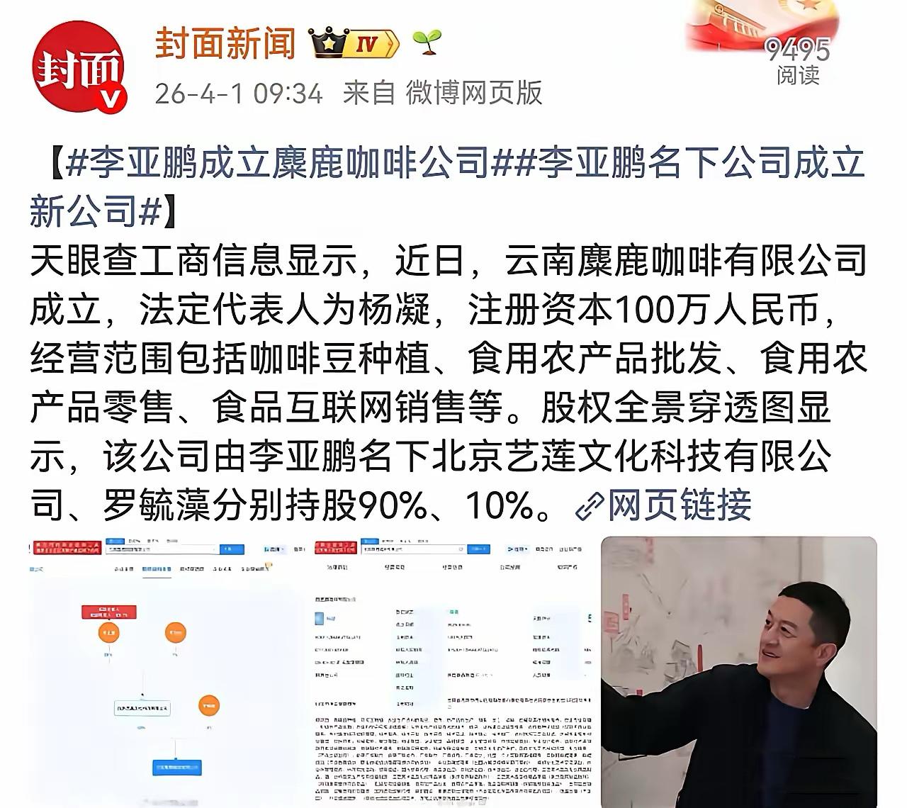 李亚鹏这下又要头疼了,深夜突上热搜,谁也没料到他还敢往创业坑里跳。 刚成立云南麋鹿咖啡,他旗下公司控股90%,从种豆到线上销售一把抓,可注册资本仅100万。 如今咖啡赛道卷到白热化,这点钱投入市场,连水花都溅不起来。 这些年他创业一路踩坑,地产、文旅接连折戟,还深陷债务纠纷,明明不是经商的料,却偏要执着跨界。 情怀不能当饭吃,没有精准定位和充足底气,盲目入场只会重蹈覆辙。 比起屡战屡败的坚持,认清自己、选对赛道才更重要。 你觉得李亚鹏这次能翻盘吗?