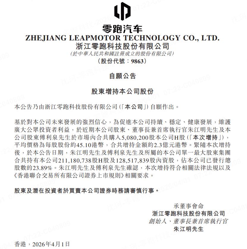 零跑一度成绩单出炉!海内外双发力,全矩阵就位稳了 2026年一季度,零跑汽车在海内外市场均取得不错成绩,交出了一份稳健向好的成绩单。 国内市场,零跑保持领跑态势:3月单月交付50029台,一季度累计销量超11万台,在新势力中表现突出。与此同时,其全球化战略也逐步落地见效,一季度出口量超4万台,在造车新势力出海阵营中处于领先位置。 这份战绩充分说明,零跑的产品不仅能在中国市场获得成功,其“好而不贵”的价值主张,更凭借“全域自研”的核心技术支撑,具备较强的全球普适性,能够适配不同地区的市场需求。 随着全新车型A10的上市,以及旗舰车型D19将于4月16日登场,零跑A/B/C/D四大系列的全产品矩阵已基本构建完成。如今的零跑,已形成覆盖从入门到旗舰全价位段、能够满足全球不同市场、不同层级消费者多样化需求的产品阵容。 从“国内领跑”向“全球领跑”迈进,零跑的战略目标始终清晰而坚定。创始人朱江明及核心股东傅利泉累计近12亿港元的持续增持,既是对公司整体价值的看好,也体现出对全球化战略这一核心增长支柱的长期信心。 一季度的“开门红”,为零跑后续发展注入了强劲动力,有望成为驱动零跑向年销百万目标冲刺的强劲新引擎。零跑正以实际实力证明,中国品牌已具备输出优质技术、行业标准和全新价值理念的全球竞争力。