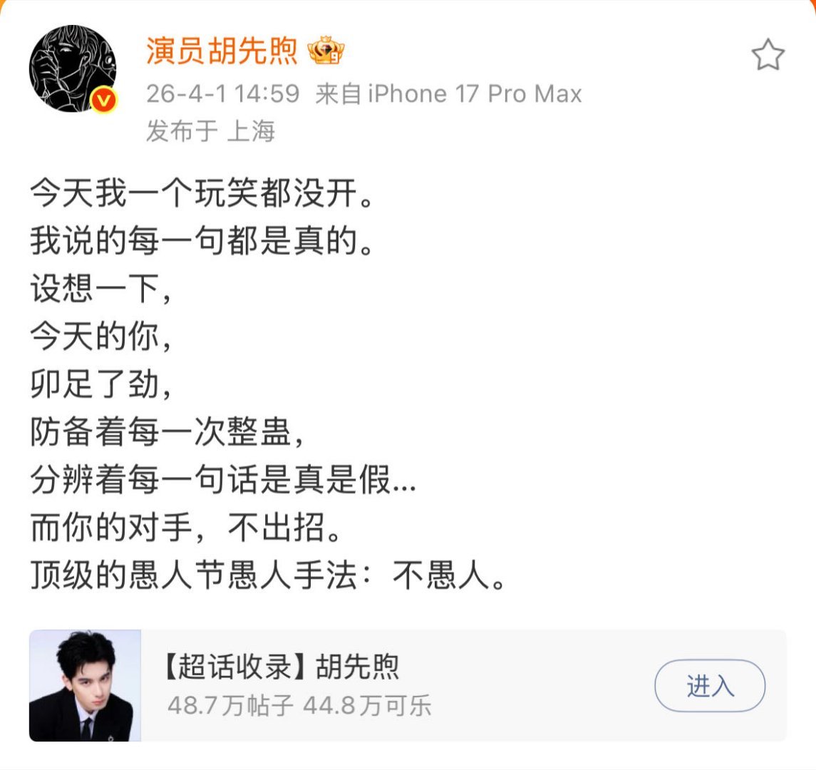 胡先煦有点反骨都用在愚人节了胡先煦顶级的愚人节愚人手法 我宣布今天的胡先煦是「捕