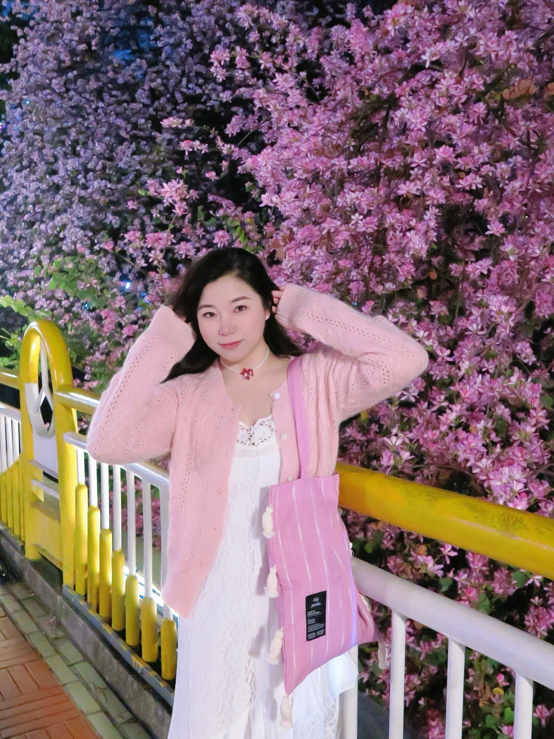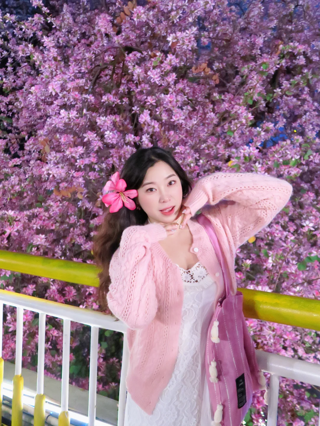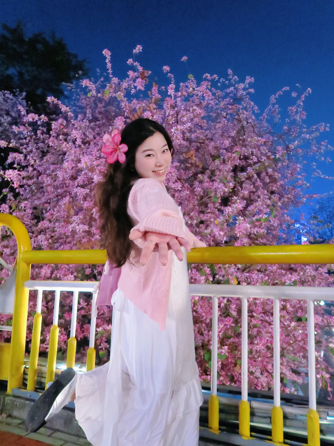 紫荆花拍了很多,没想到晚上拍还是第一次 发现桥上其实挺亮的,蛮多灯光都可以补面光 如果有稍微轻柔的补光灯也能带着,本来怕太黑想打开闪光灯拍,没想到不开闪光灯的效果更佳网感 - 醒图滤镜:用了一个鲜花增强 拍照小心机:购买了一朵假的紫荆花发夹 [捂嘴笑R][捂嘴笑R]