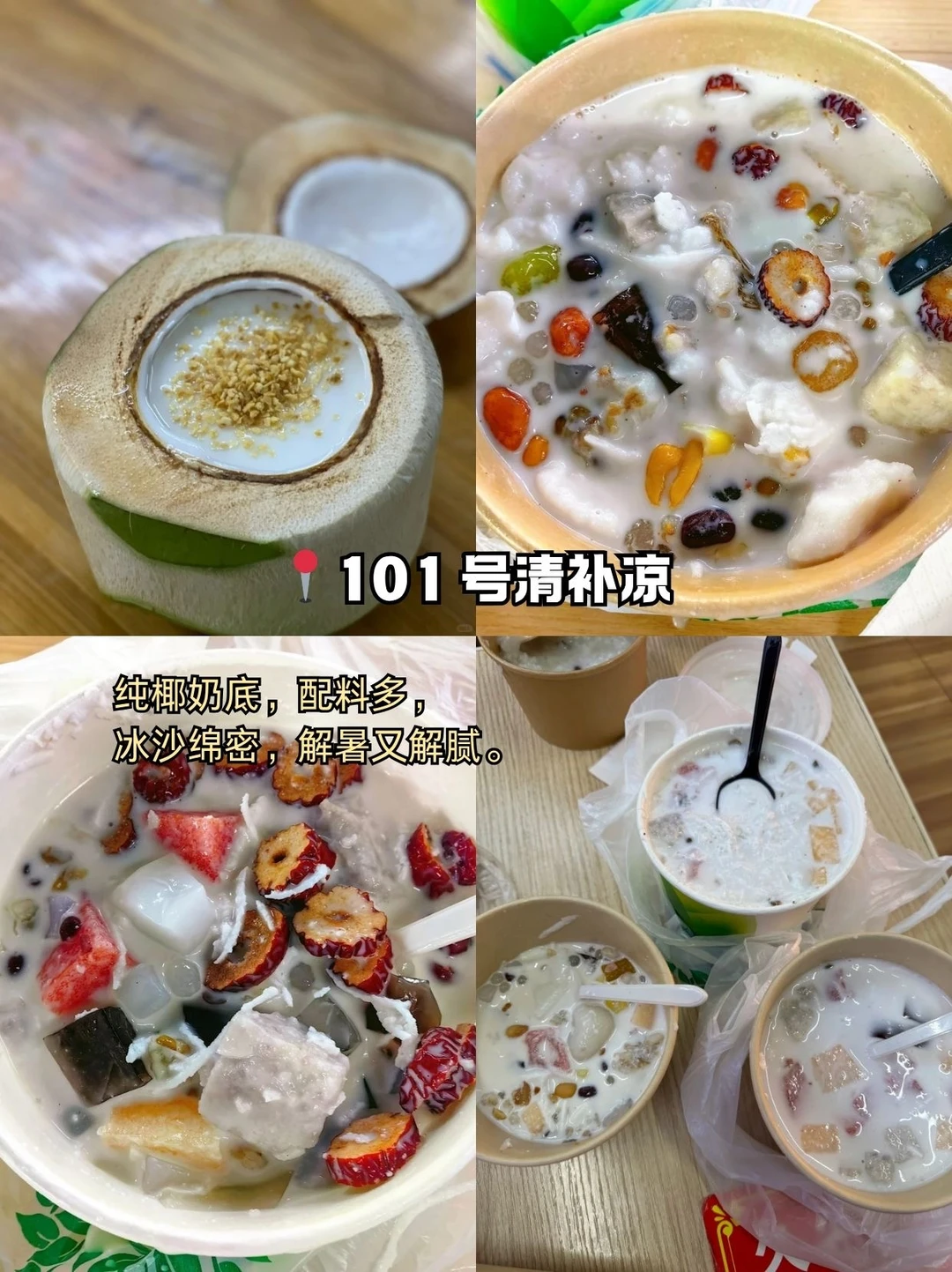 📍101 号清补凉:纯椰奶底,配料多,冰沙绵密,解暑又解腻。