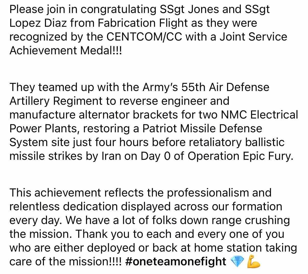 两名MD二等人“制造小队”(Fabrication Flight)的二级军士荣获美军中央司令部颁发的联合服役成就奖章。他们与三等人第55防空炮兵团合作,对因故障停摆的(NMC)"爱国者"导弹系统"电源发电车"(EPP)发电机支架进行逆向工程并完成制造,在“史诗狂怒行动”第0天伊朗导弹打击前仅4小时恢复“爱国者”防空阵地运作。军事ai新视野美伊以冲突