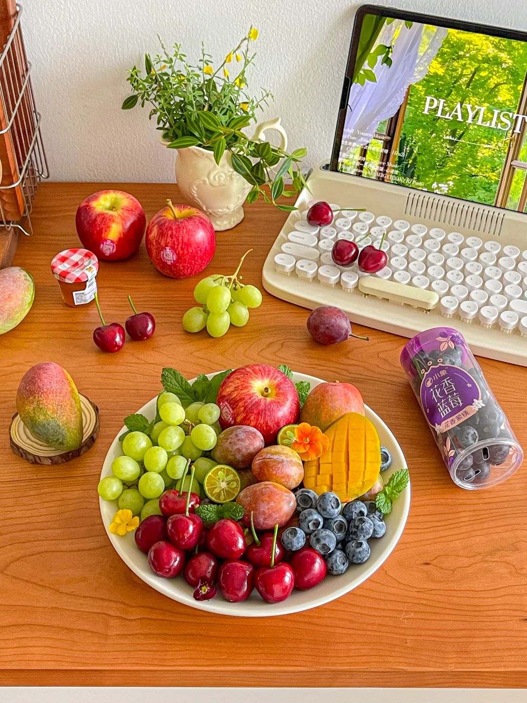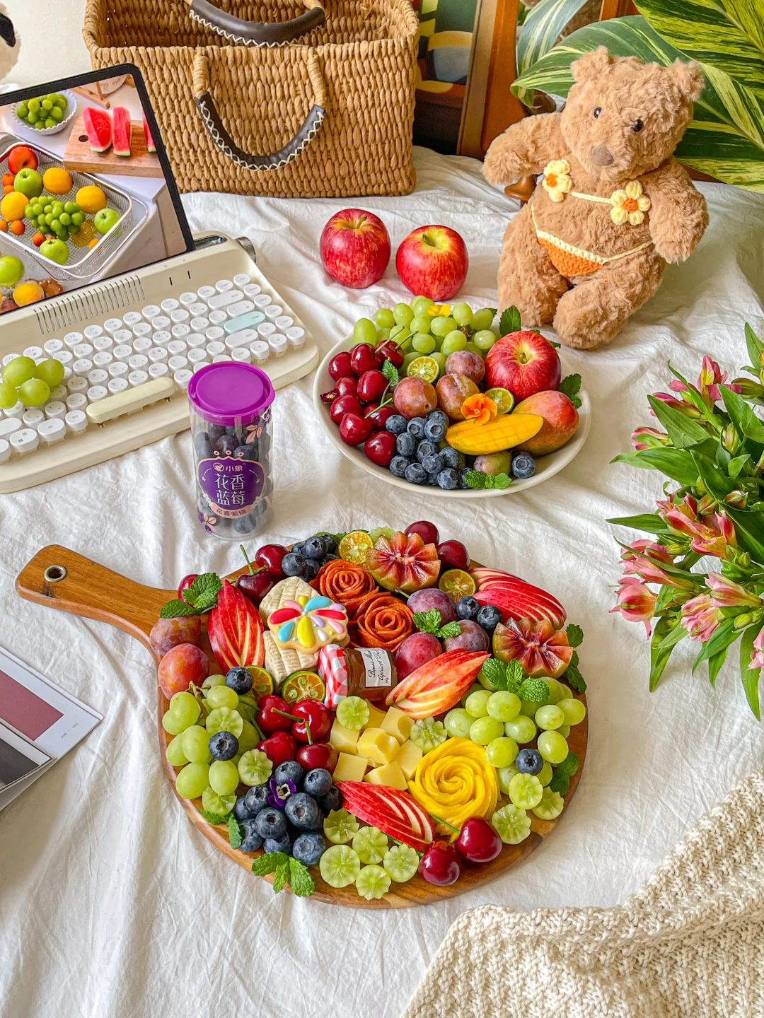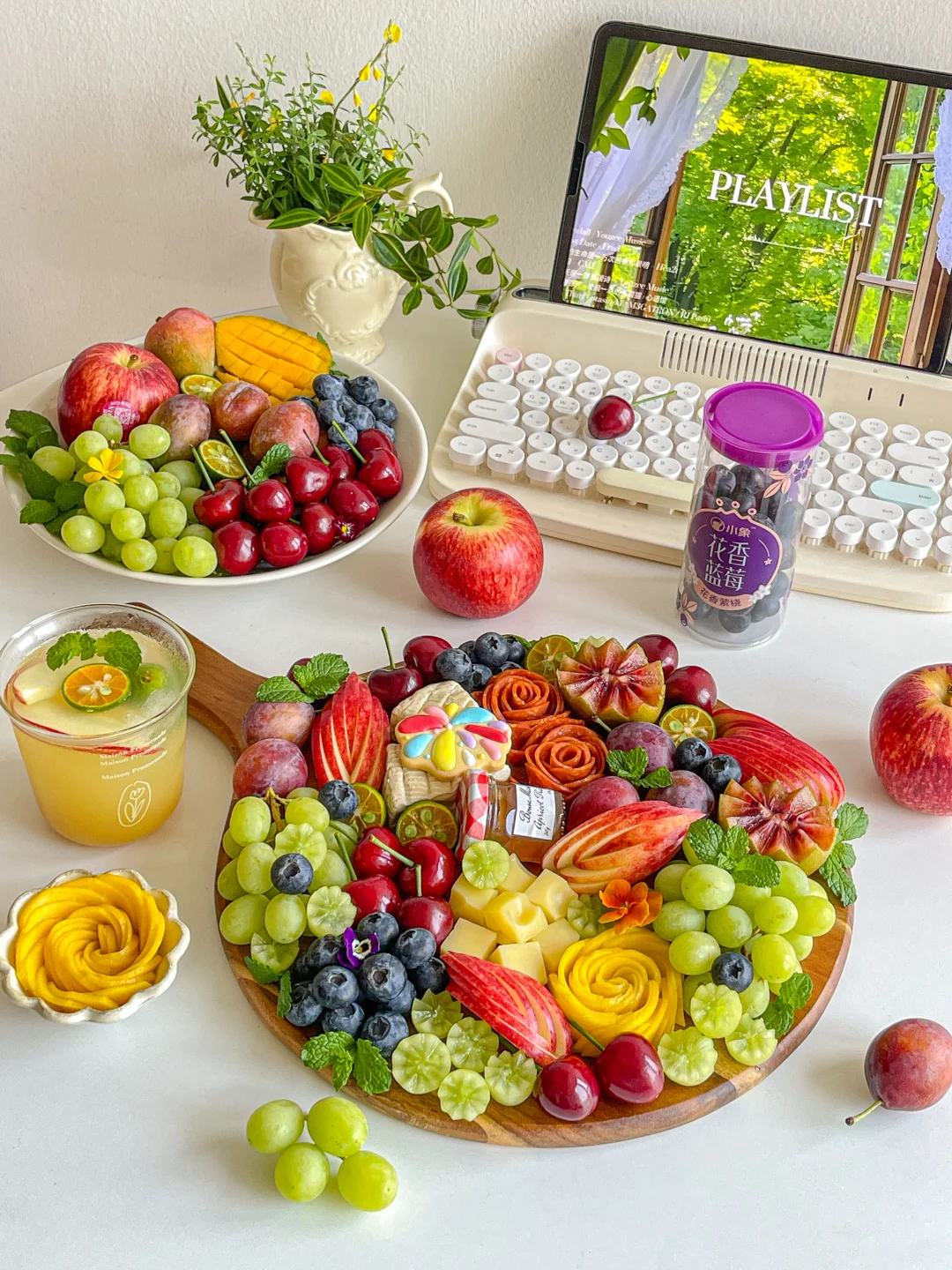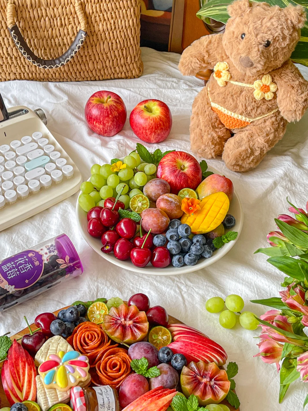 大连美早樱桃➕智利甜地球青提➕新西兰加力果➕海蓝贵妃芒➕智利进口西梅➕小象花香蓝莓➕火腿➕奶酪➕草莓果酱➕奇异果➕饼干