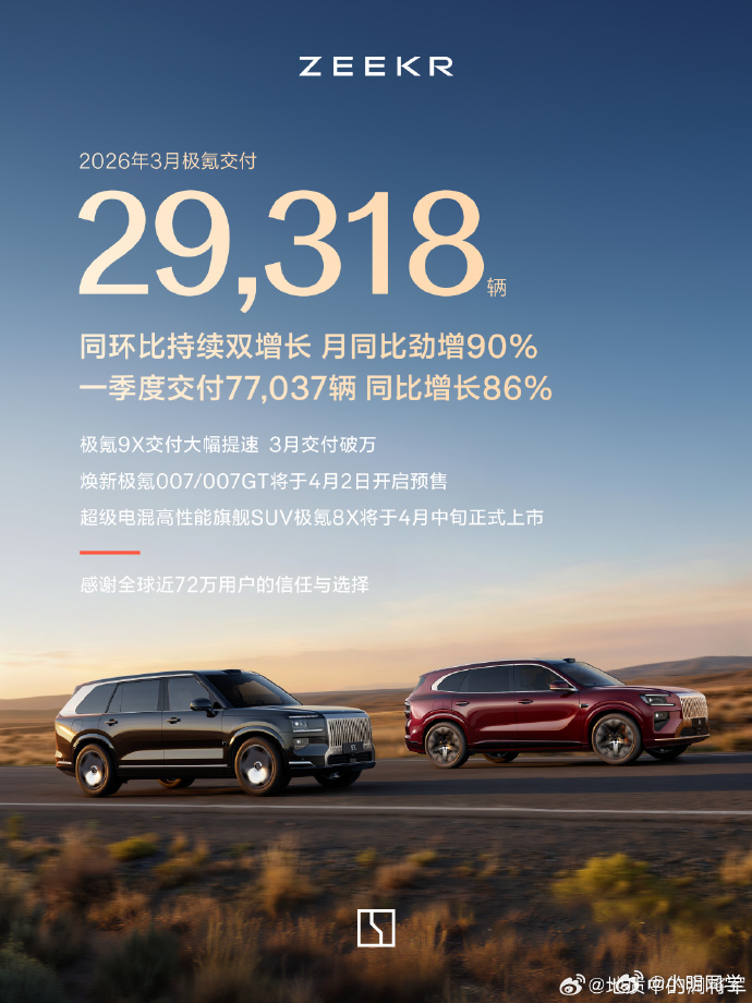三月份国内造车新势力们的品牌销量出炉:零跑汽车: 交付 50,029 辆,同比增长35%。理想汽车: 交付 41,053 辆,同比增长12%。广汽昊铂埃安BU: 销量 38,268 辆,实现同环比双增长。深蓝汽车: 全球销量 31,742 辆,环比增长87.8%。极氪: 交付 29,318 辆,同比增长90%。小鹏汽车: 交付 27,415 辆,环比增长80%。奕派科技: 交付 27,505 辆,同比增长30%。小米汽车: 交付量超过 20,000 辆。其中,新一代SU7自3月23日开启交付,9天内已交付超7,000辆。岚图汽车: 交付 15,019 辆,同比增长50.1%,环比增长79.7%。智己汽车: 销量 7,187 辆,今年一季度同比大涨97%。北汽蓝谷: 子公司3月销量 13,647 辆,同比下降4.35%。猛士汽车: 销量 2,036 辆,环比劲增97.1%。极石汽车: 交付 1,480 辆,同比增长40.2%。大家更看好哪家?
