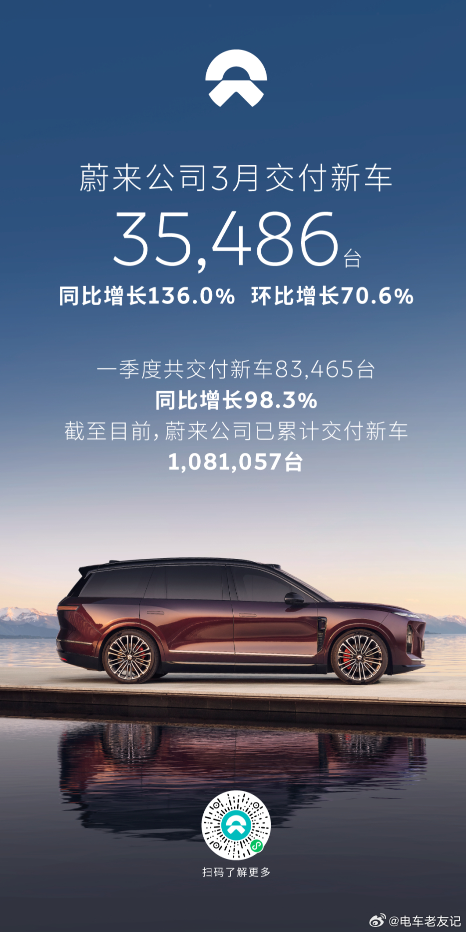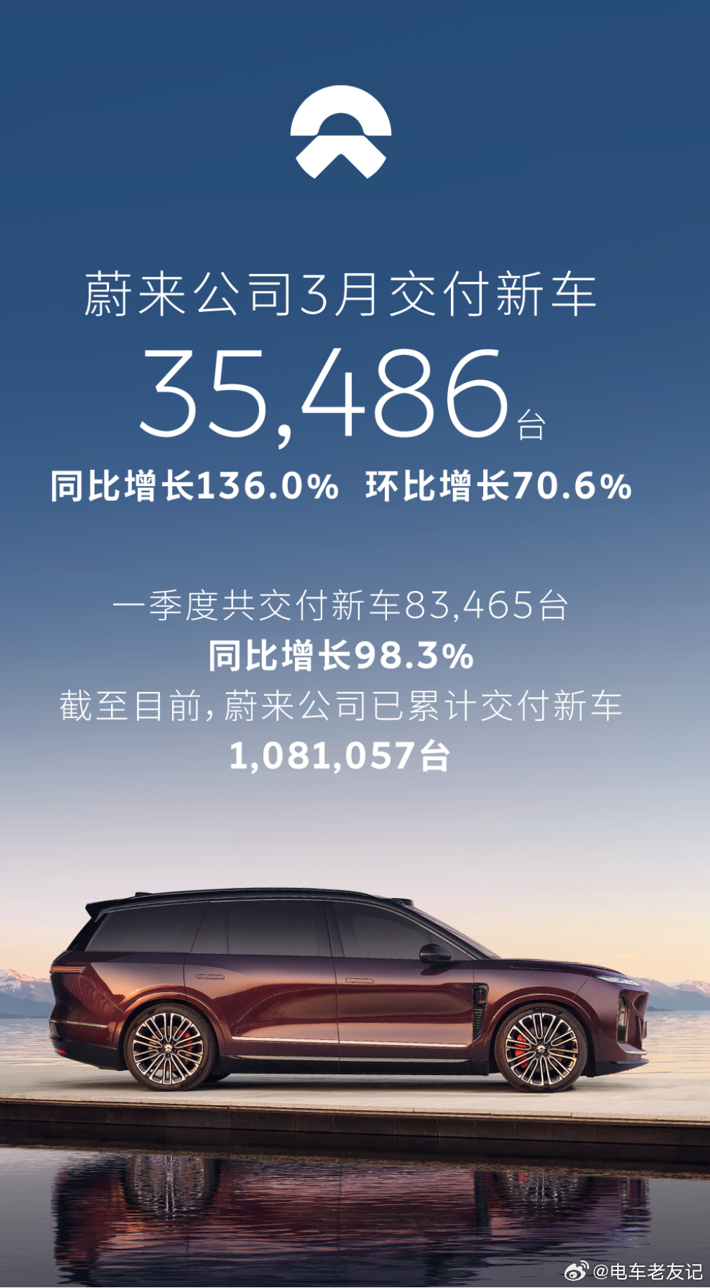 蔚来3月交付狂飙破3.5万!高质量增长势不可挡三品牌全线爆发,一季度超预期收官1️⃣ 3月交付35486台,同比+136.0%、环比+70.6%,销量暴涨2️⃣ 一季度交付83465台,同比+98.3%,超财报指引上限3️⃣ 累计交付破108.1万台,稳居智能纯电第一梯队4️⃣ 蔚来/乐道/萤火虫三品牌齐增,高端与大众市场双丰收5️⃣ 全新ES8 181天交付8万台,ES9旗舰4月9日发布,大车战略落地技术领跑、产品硬核、体系发力,蔚来迈入高质量增长新阶段!蔚来销量 蔚来ES9新能源汽车电车老友记