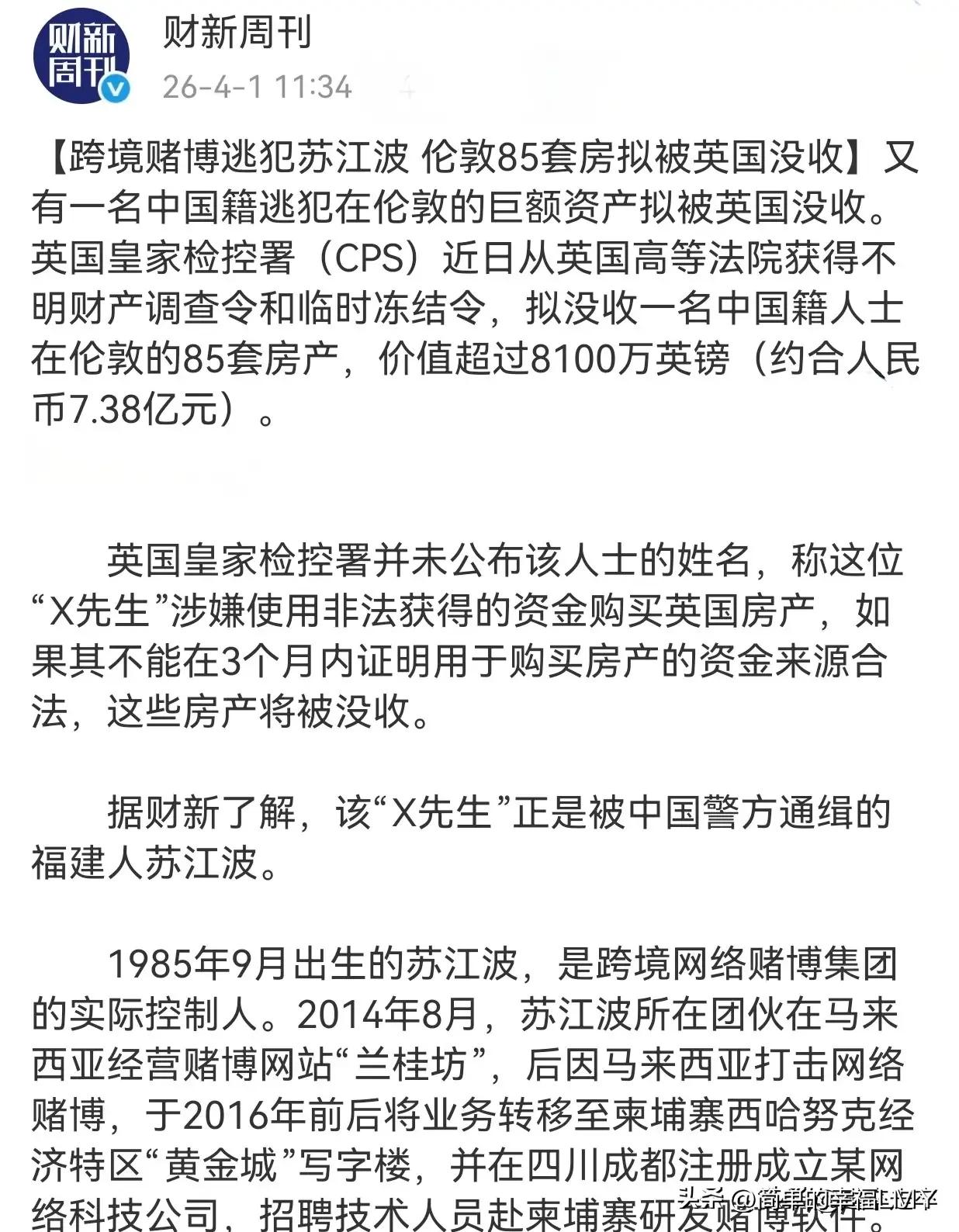 英国冻结一名中国公民在伦敦的85套房产,总价值超过8100万英镑(约合人民币7.38亿元)当事人尚未被刑事定罪。 这名被英国盯上的中国公民,乃是涉嫌跨境网络赌博的在逃人员苏江波。他是福建人,出生于1985年。早在2014年8月,苏江波就已踏上违法之路,其所在团伙在马来西亚经营着名为“兰桂坊”的赌博网站。 要知道,赌博向来是社会公害,不仅会让人倾家荡产,还会引发一系列犯罪行为,可谓是“万恶之源”。马来西亚对网络赌博进行严厉打击后,苏江波等人并未迷途知返。 而是在2016年前后将业务转移到了柬埔寨西哈努克经济特区的“黄金城”写字楼。他们还在四川成都注册了一家网络科技公司,堂而皇之地招聘技术人员前往柬埔寨,只为研发那害人不浅的赌博软件。 这种行为,简直是明目张胆地挑战法律底线,怎能不让人愤慨?苏江波深知自己的行为见不得光,为了掩盖非法所得,他想出了种种歪招。他通过加勒比海国家圣基茨和尼维斯的投资入籍项目,也就是所谓的“黄金护照”,在英国注册了公司。 有了这层“合法”外衣后,他从2023年9月起,便在伦敦大肆购买房产。他就像一个贪婪的“吸血鬼”,疯狂地吞噬着伦敦的房产资源。短短时间内,他名下就拥有了85套房产,其中一套位于伦敦市中心的顶层公寓,更是价值高达1300万美元。 这些房产分布在伦敦的多个核心区域,不是高端公寓,就是豪华别墅,随便一套都足以让普通人望尘莫及。然而,“天网恢恢,疏而不漏”,苏江波以为自己能凭借这些手段逃脱法律制裁,可他终究是痴心妄想。 就在他忙着购置房产的时候,福建省大田县人民法院于2023年9月15日发布了通缉令,将他列为38名在逃犯罪嫌疑人之一,他被指控犯有非法赌博、诈骗及网络犯罪等多项罪名。法院还公布了他的照片和住址信息,让他无处遁形。此时的苏江波,就如同“过街老鼠”,人人喊打。 英国方面也注意到了苏江波的异常行为。英国皇家检控署依据《2002年犯罪收益法》,向高等法院申请了“不明财富来源令”和“临时冻结令”。这意味着什么呢? 苏江波需要在3个月内证明购房资金的合法来源,否则这些房产就会被英国政府没收。这一举措,无疑是对苏江波的沉重打击。他本想在英国“逍遥法外”,享受着非法所得带来的奢华生活,却没想到英国也不会成为他的“避风港”。 值得一提的是,这并非英国首次针对中国籍经济逃犯采取此类行动。2025年,新加坡洗钱案逃犯苏炳海在英国的资产就被没收,价值约2.6亿人民币。 英国皇家检察署还表示,在过去五年里,他们通过没收令已经追回了4.78亿英镑,其中有9500万英镑返还给了受害者。从这些数据可以看出,英国在打击非法资产方面,确实采取了一系列行动,也取得了一定的成果。 那么,英国冻结苏江波房产这一事件,给我们带来了哪些启示呢?首先,对于那些违法犯罪分子来说,不管他们逃到天涯海角,不管他们用什么手段掩盖非法所得,都难以逃脱法律的制裁。 “若要人不知,除非己莫为”,任何违法犯罪行为最终都会被揭露,他们必须为自己的行为付出代价。其次,这也提醒各国政府,在打击跨国犯罪方面,需要加强合作。 苏江波的案件涉及多个国家和地区,正是因为各国之间的信息共享和执法合作,才让他的罪行逐渐暴露,让他的非法资产无处可藏。对于我们普通人来说,这起事件也是一个警示。 我们要时刻牢记,要通过合法途径获取财富,不能被金钱冲昏了头脑,走上违法犯罪的道路。同时,我们也要增强法律意识,遇到类似的违法犯罪行为,要及时向相关部门举报,让这些“威胁”早日被铲除,让我们的社会更加和谐、稳定。 总之,苏江波在伦敦的85套房产被冻结,是他咎由自取。等待他的,将是法律的公正审判。这一事件也向全世界宣告,违法犯罪者无论如何挣扎,都无法逃脱正义的“牢笼”,正义或许会迟到,但永远不会缺席。