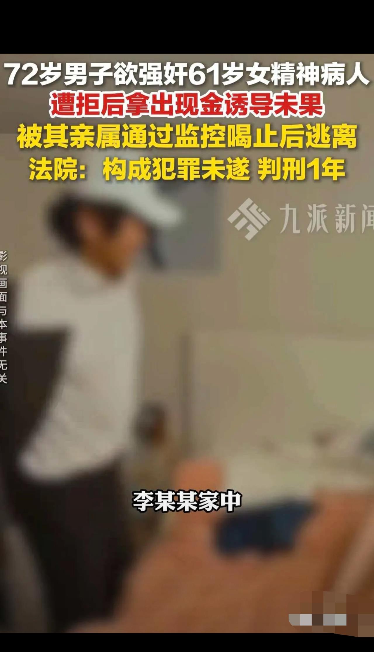 广西,72岁男子溜到本村一61岁患有精神疾病的女子家中,抚摸女子隐私部位,遭女子拒绝后,男子不罢休,拿出现金哄骗女子,又被拒绝,男子直接霸王硬上弓,正巧女子家属通过监控看到这一幕,大声喝止他,男子一看被人发现,立马逃跑,最终,法 在广西一个小村庄,发生了一件简直突破底线、丧尽天良的恶性案件!一名72岁的老汉,竟然把坏主意打在了同村一位61岁患有精神病的独居大姐身上!这种人真的是坏到骨子里了! 事情经过真的让人头皮发麻! 那是2023年11月的一天下午,72岁的刘某业看准李某某独自在家,而且精神有问题,直接溜进了人家家里! 他一进门就想耍流氓,先伸手去摸女子的隐私部位。人家大姐本能地推开他,他居然不知悔改,竟然掏出钱想哄骗对方! 这哪是给钱,这是把人当傻子侮辱啊!软的不行,这老头直接撕破脸皮,强行搂抱、企图霸王硬上弓! 好在!苍天有眼,家人留了一手! 李某某的家属早就料到会有坏人打主意,提前装了监控!这无耻的一幕,被家属通过手机看得一清二楚,立马冲出来大声喝止! 那老头吓得魂飞魄散,扔下钱就仓皇逃窜!跑得了和尚跑不了庙,监控就是铁证! ⚠️重点来了!这种情况,是算未遂还是中止?法院判得太精彩了! 很多网友可能不懂,这两者可是天差地别啊! - 犯罪中止:是自己良心发现,主动不干了。 - 犯罪未遂:是想干,但因为害怕被抓、被人发现而干不成了。 法院经过严谨审理,当场就判了!这老头属于强奸罪未遂! 为什么?因为他根本不知道家里有监控!他停下来是因为怕被抓,是出于恐惧,而不是真心悔改!如果没人发现,他绝对是要得逞的! 最终,法院判处刘某业有期徒刑一年! 💬网友热评: 1. @正义之师:才一年?是不是有点太轻了?这种坏人就该多判几年! 2. @暖心宝妈:还好装了监控!给所有家里有病人、老人的提个醒,光靠善良没用,必须要有硬手段保护家人! 3. @吃瓜群众:72岁了还干这种事,真是为老不尊,晚节不保!法律不能放过他! 我也想说两句:欺负精神病人,真的是天底下最卑劣的行径!她连拒绝的力气都有限,你怎么下得去手? 不过这也给我们敲了警钟:对于身边的弱者,我们不仅不能欺负,更应该主动保护。同时,家里有特殊成员的,监控真的是保命神器,一定要装! 你们觉得这个判决公正吗?对于保护弱势群体,你有什么好建议?评论区聊聊! (来源:公开法律文书)
